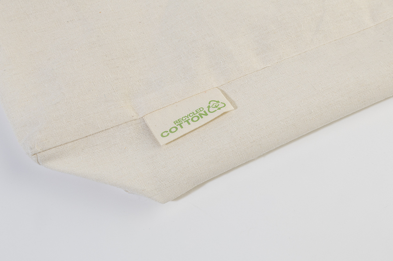 Nákupná taška s klinom a dlhými ušami zo 70% recyklovanej bavlny a 30% RPET polyesteru, 140 g/m². S výraznou etiketou o recyklovanej bavlne.