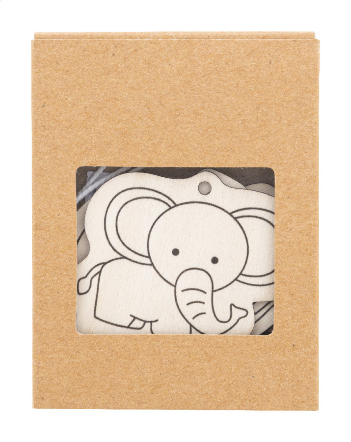 3dielna sada drevených omaľovánok so zvieratkami, vrátane 4 drevených pasteliek a závesných šnúrok. V krabičke z kraftového papiera.