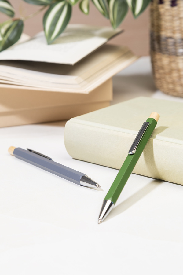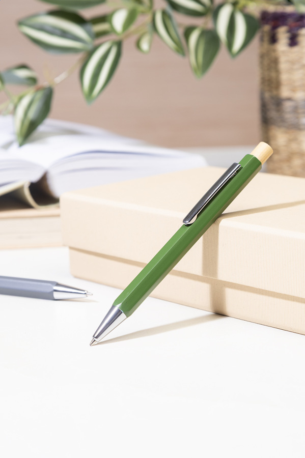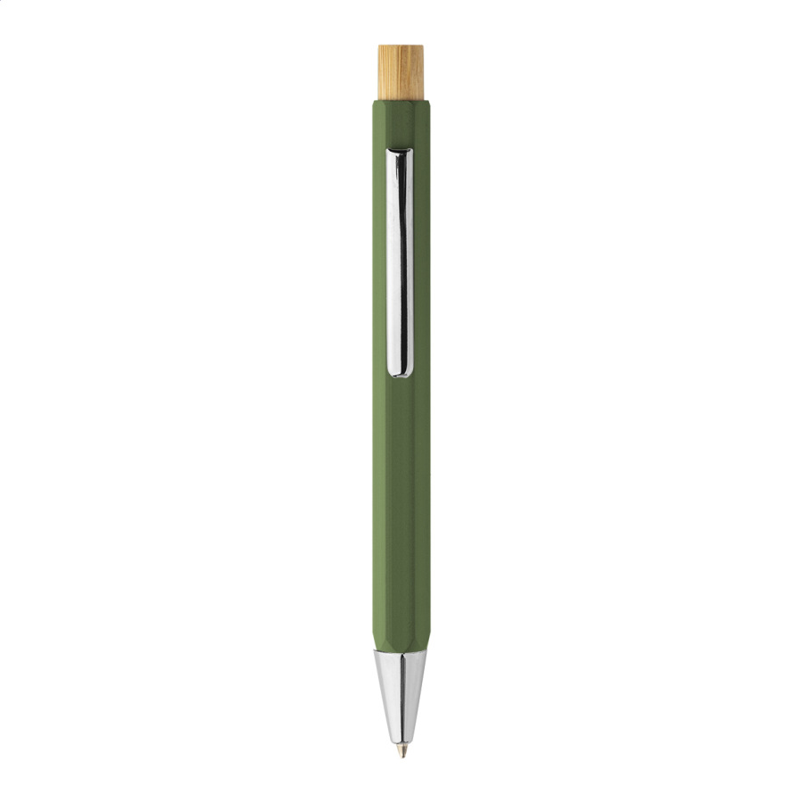 Šesťhranné guličkové pero z recyklovaného hliníka s bambusovým tlačidlom a chrómovanými časťami. S modrou náplňou.
