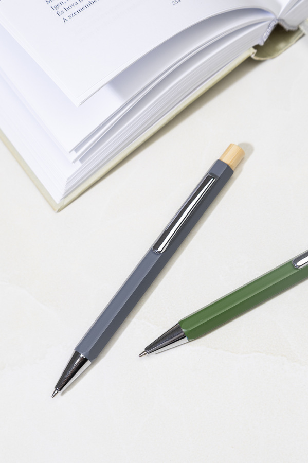 Šesťhranné guličkové pero z recyklovaného hliníka s bambusovým tlačidlom a chrómovanými časťami. S modrou náplňou.