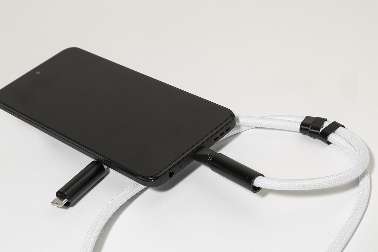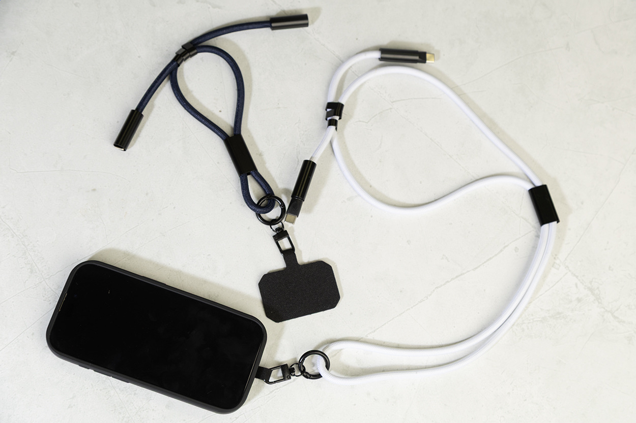 Šnúrka s držiakom na mobil z RPET s vložkou pre telefón, karabínou a integrovaným nabíjacím káblom USB-C na USB-C so skrytými konektormi. Podporuje rýchle nabíjanie a prenos dát PD 60W.