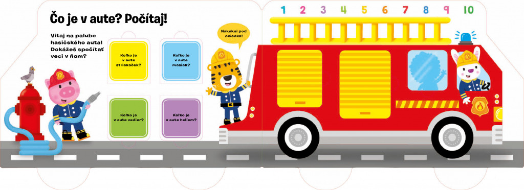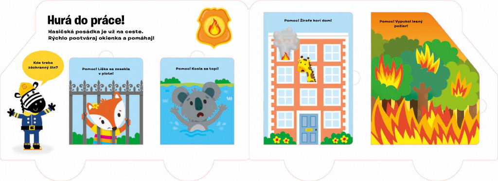 V tomto zábavnom leporele s veselými obrázkami a viac ako 25 otváracími okienkami sa deti oboznámia s rozmanitou a záslužnou činnosťou hasičov. Dozvedia sa, čo všetko k svojej práci potrebujú, v akých situáciách dokážu pomôcť a akí ďalší hrdinovia – záchranári s nimi spolupracujú. Zároveň si precvičia počítanie alebo trebárs určovanie protikladov.