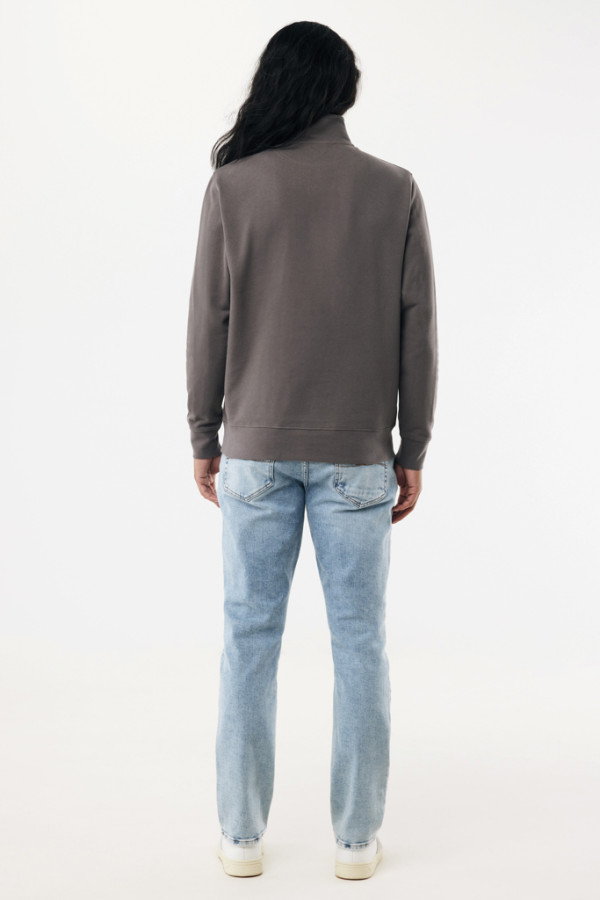 Moderný unisex sveter s krátkym zipsom vyrobený zo 100 % bavlny – 30 % recyklovanej a 70 % organickej, s gramážou 300 g/m². Sveter má golier z rovnakého materiálu, dlhé vsadené rukávy a rebrovanie 1x1 na manžetách a spodnom leme. Vnútorná strana je z francúzskeho froté. Použitie pravých recyklovaných a organických materiálov a tvrdenia o environmentálnom vplyve sú garantované technológiou AWARE™ s fyzickým identifikátorom a technológiou blockchain. Naskenovaním QR kódu získate prístup k digitálnemu pasu produktu. 2 % z výťažku z každého predaného kusu sú venované organizácii Water.org. Produkt je certifikovaný podľa OEKO-TEX® STANDARD 100 Centexbel. Vzhľadom na charakter recyklovaných priadzí sa môžu vyskytnúť drobné nečistoty a farebné odchýlky.