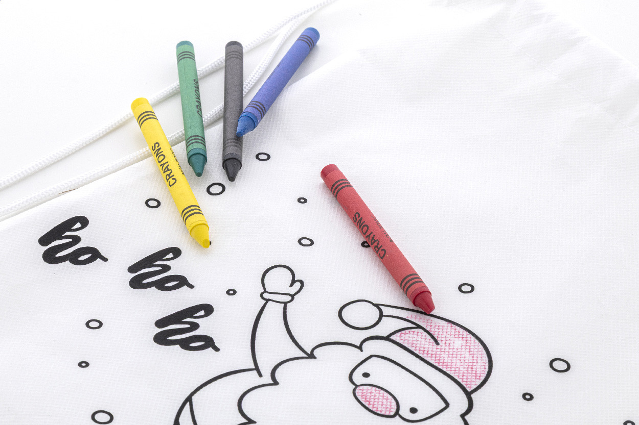 Vianočný vak na vyfarbovanie so sťahovacou šnúrkou z netkanej RPET tkaniny s 5 voskovkami.