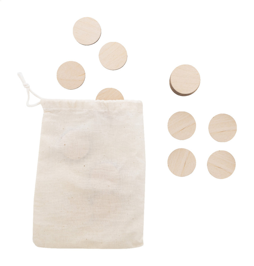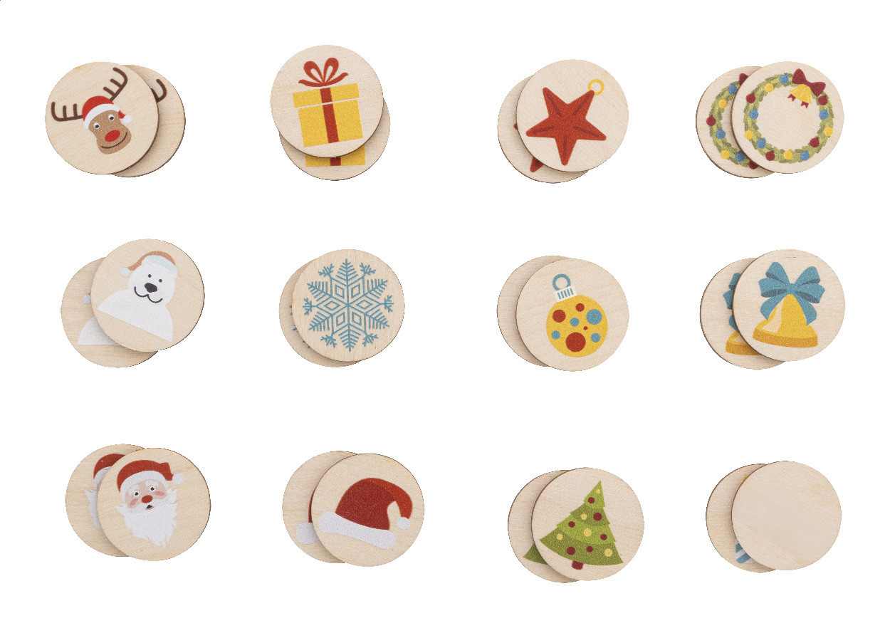 Pexeso z laminovanej brezovej preglejky s vianočnými motívmi v bavlnenom vrecúšku. S 24 dlaždicami (ø35 mm).