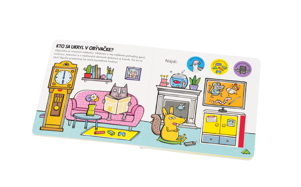 Obľúbený formát leporela s odklápacími chlopňami a posuvnými dvierkami poskytuje malým čitateľom dôvtipnú zábavu a zároveň formuje ich predstavu o tom, ako to vyzerá v jednotlivých miestnostiach v dome a na čo tieto miestnosti zvyčajne slúžia. Práca s takouto knihou prispieva aj k zlepšovaniu koordinácie ruka – oko. Deti tu objavujú zvieratká ukryté v kuchyni, v obývačke, v detskej izbe, v kúpeľni, či na záhradke a riešia jednoduché úlohy zamerané na rozvoj pozornosti a základných matematických predstáv.