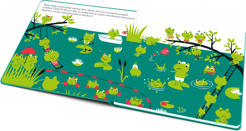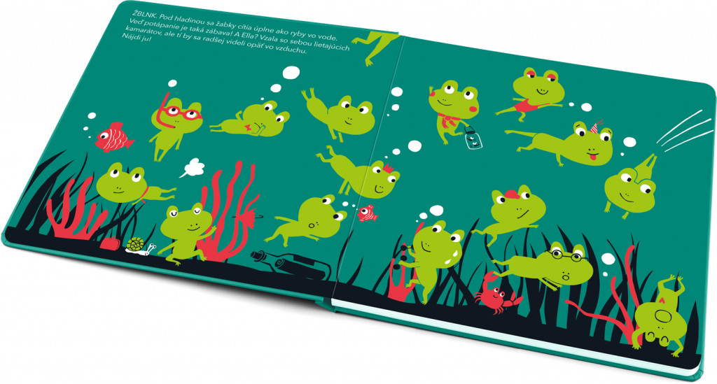 Toto výnimočné leporelo plné roztomilých žabiek zaujme nielen jednoduchou modernou ilustráciou a výraznými farbami, ale aj tým, že nie je len na čítanie a prehliadanie ako väčšina ostatných. Hlavná hrdinka, žabka Ella, ktorú deti nájdu na každej dvojstrane, je totiž nádherne zamatová. Odhaliť ju medzi množstvom ďalších žabiek voľným okom je veľmi ťažké, ale stačí pohladiť stránky knihy rukou a Ellu ľahko nahmatáte. Výborná zábava pre všestranný zmyslový rozvoj dieťaťa!