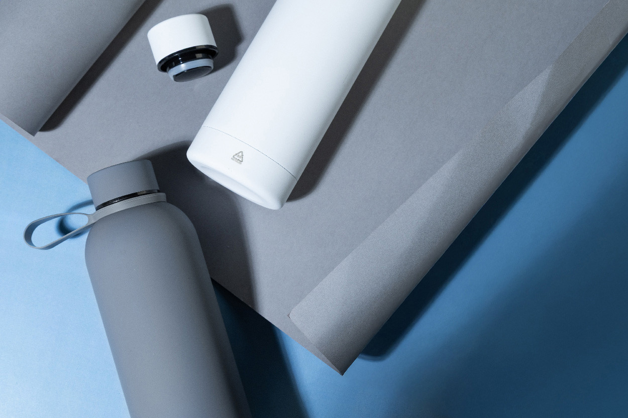 Dvojstenná vákuová fľaša z recyklovanej nerezovej ocele s pogumovanou úpravou a silikónovou rukoväťou, 500 ml.