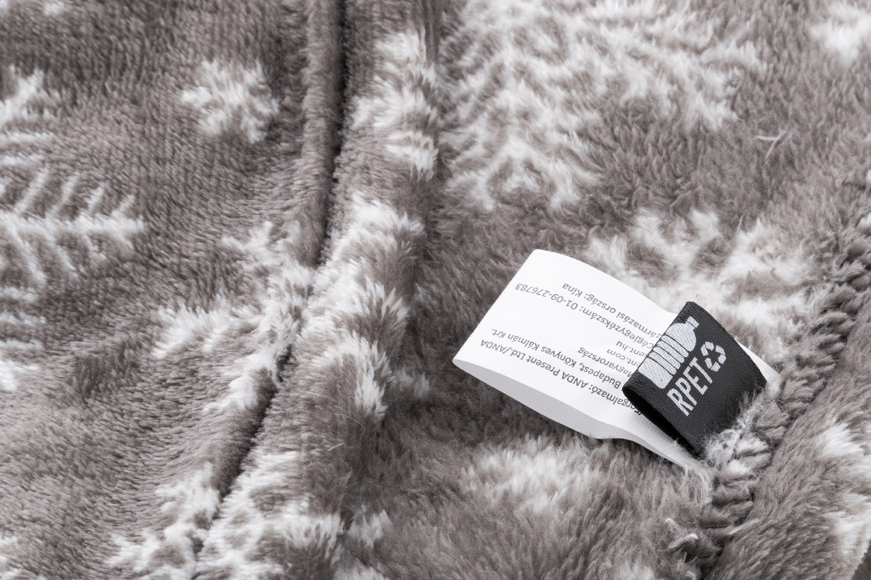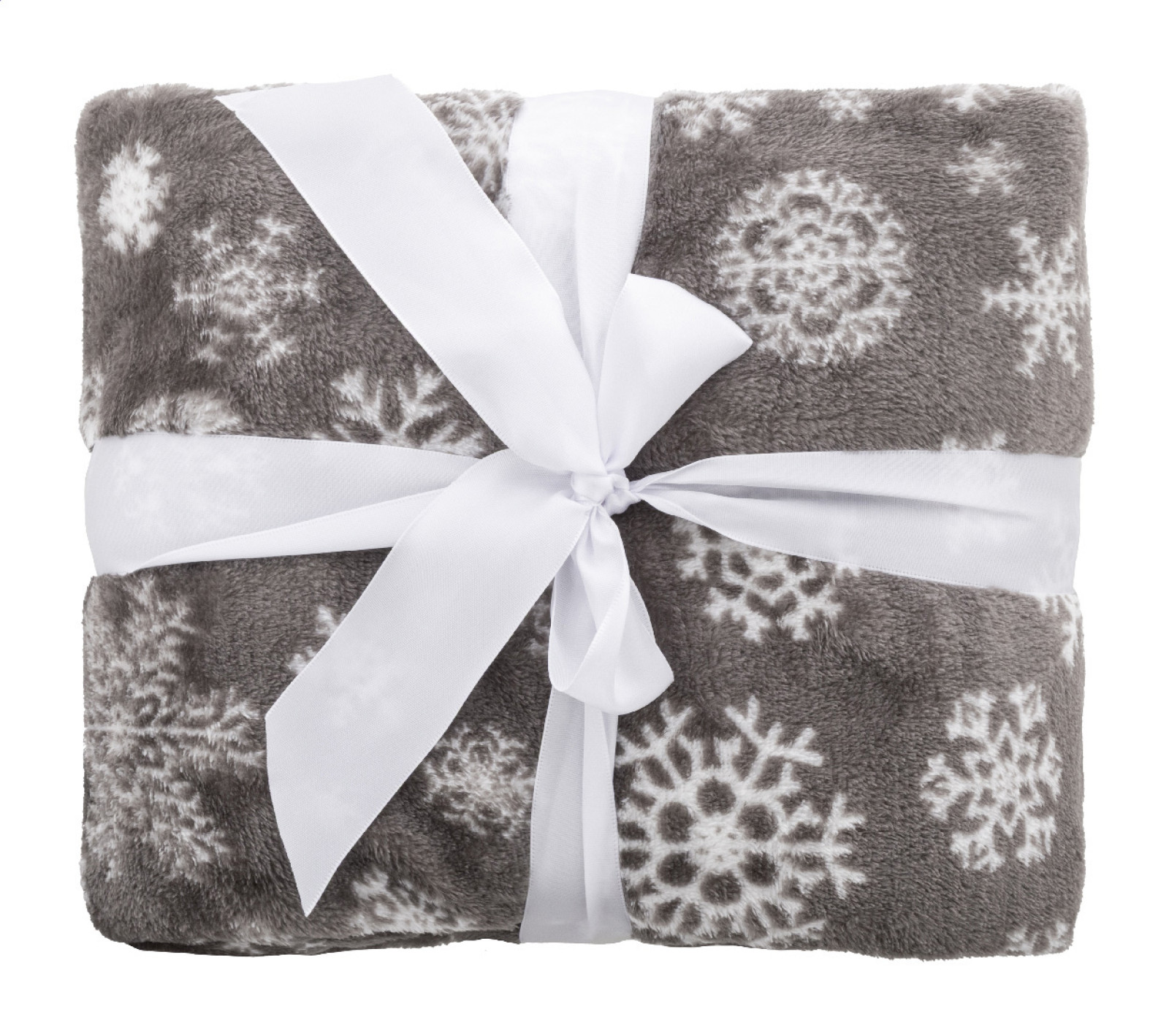 RPET flanelová fleecová vianočná deka, 260 g/m². S potlačiteľnou papierovou kartou a stuhou.