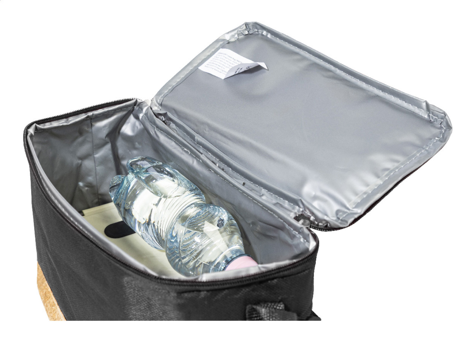 Chladiaca taška na zips z 600D RPET polyesteru s prírodnou korkovou základňou, PEVA polstrovaním a nastaviteľným ramenným popruhom. S výrazným štítkom RPET.