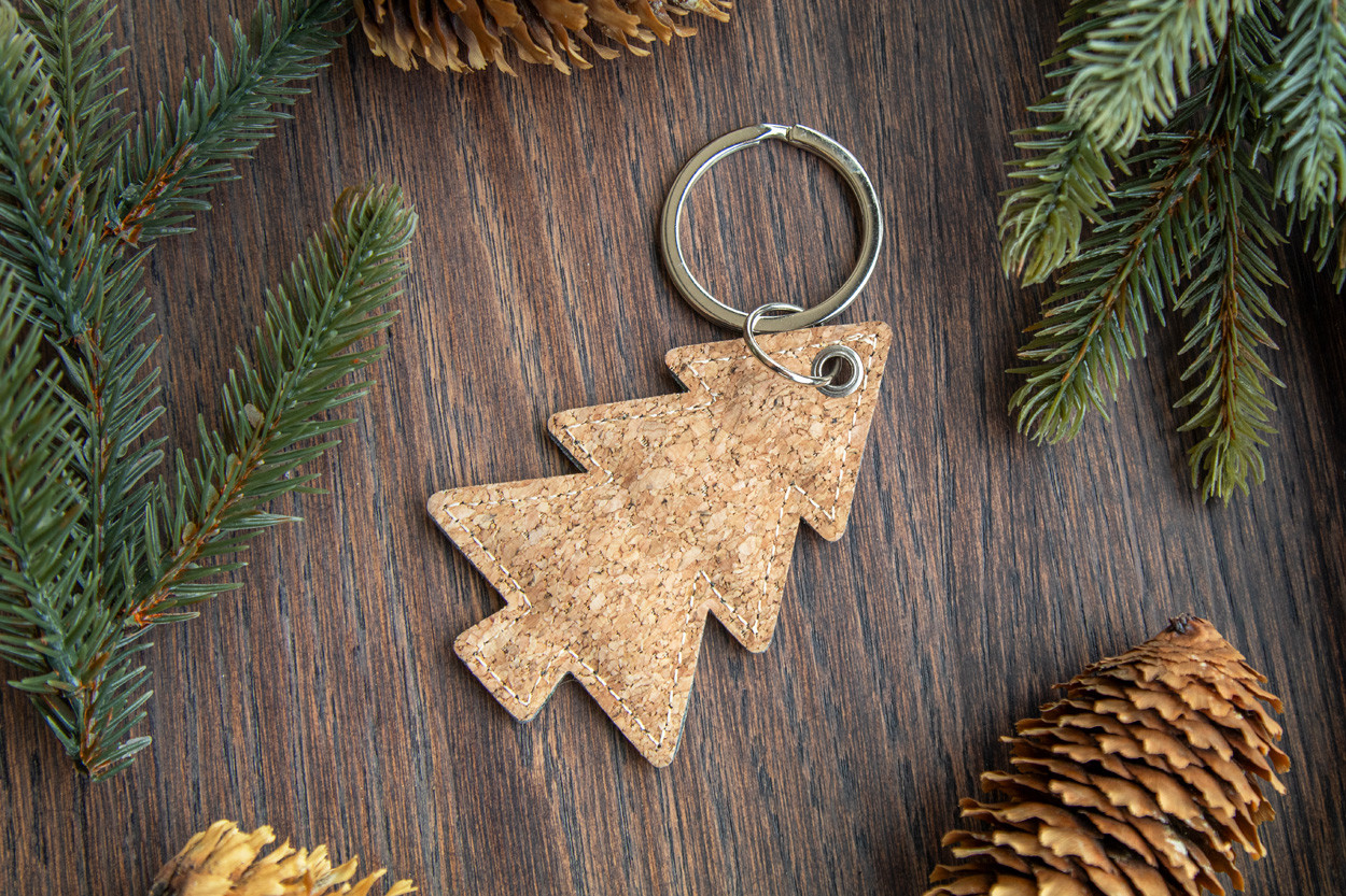 Prívesok na kľúče z prírodného korku a PU kože v tvare vianočného stromčeka s kovovým krúžkom.