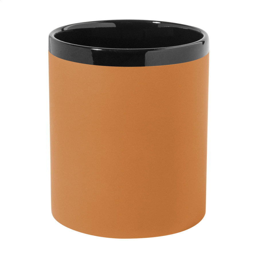Keramický hrnček s mäkkým pogumovaným povrchom a čiernym vnútrom a okrajom, 300 ml. So špeciálnym povrchom na gravírovanie, gravírované logo ladí s farbou na vnútornej strane. V krabičke z kraftového papiera.