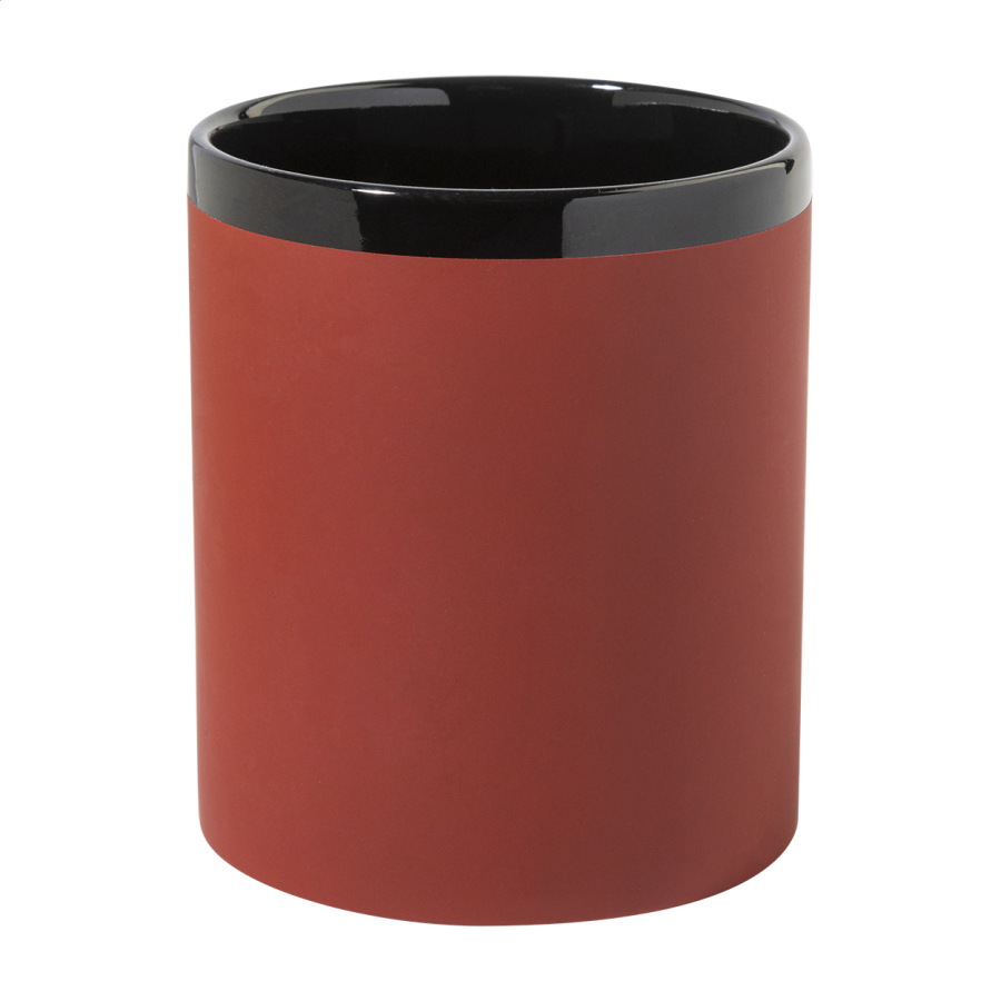 Keramický hrnček s mäkkým pogumovaným povrchom a čiernym vnútrom a okrajom, 300 ml. So špeciálnym povrchom na gravírovanie, gravírované logo ladí s farbou na vnútornej strane. V krabičke z kraftového papiera.