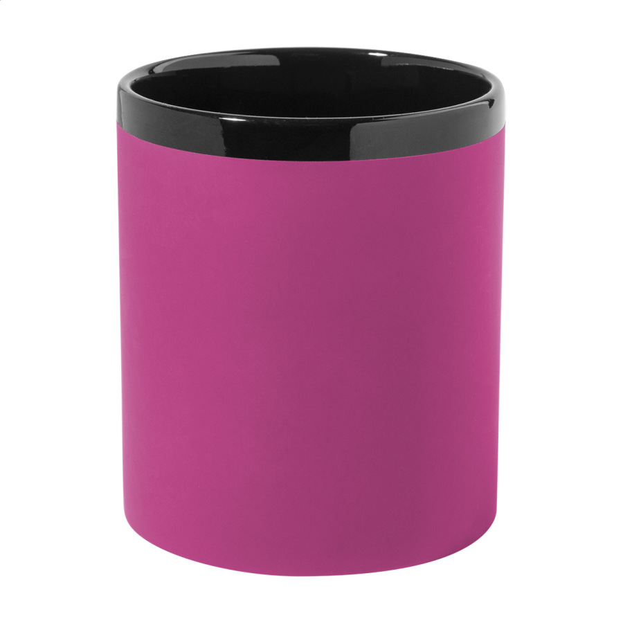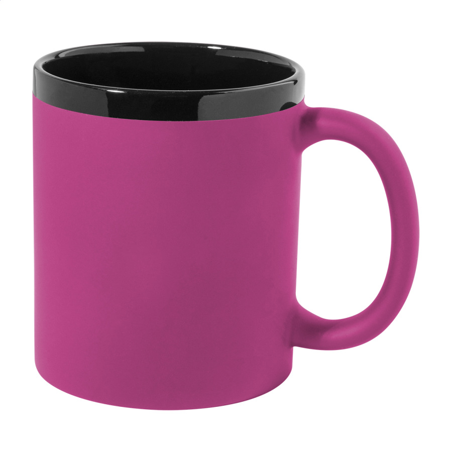 Keramický hrnček s mäkkým pogumovaným povrchom a čiernym vnútrom a okrajom, 300 ml. So špeciálnym povrchom na gravírovanie, gravírované logo ladí s farbou na vnútornej strane. V krabičke z kraftového papiera.