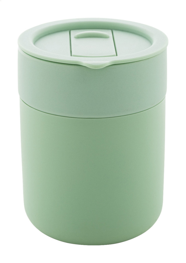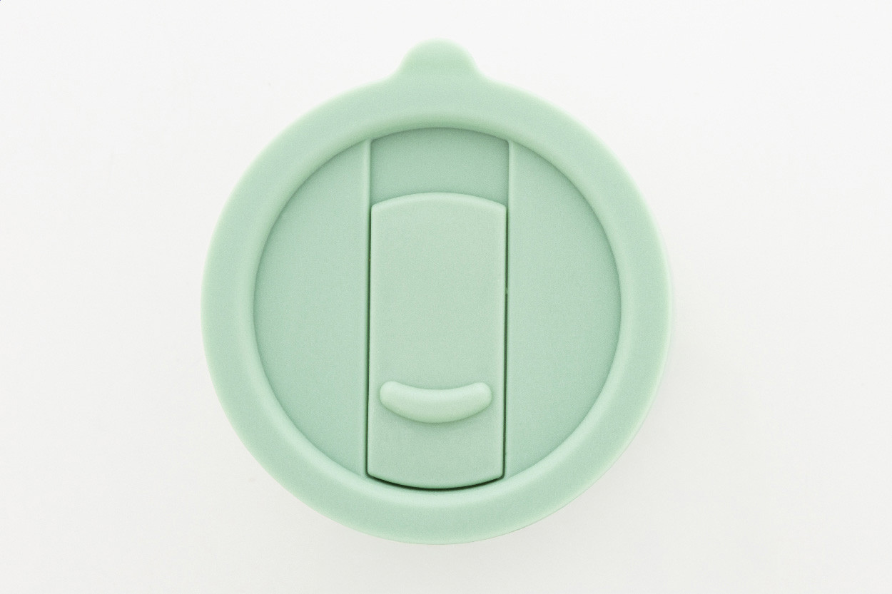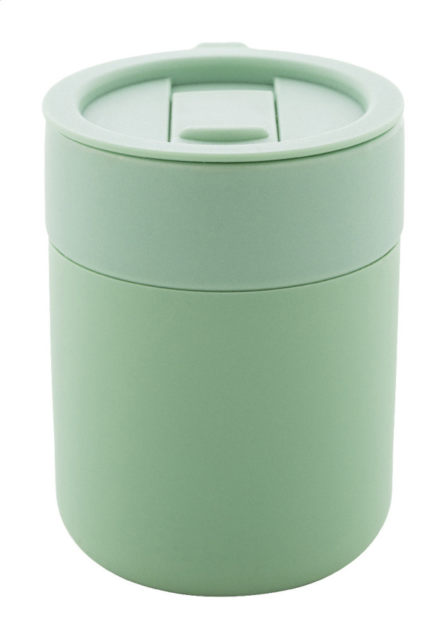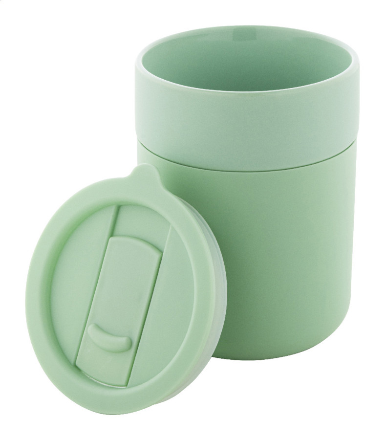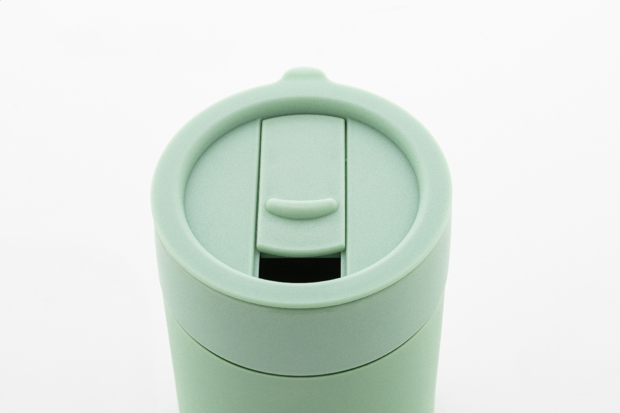 Silikónom potiahnutý keramický cestovný kelímok s PP plastovým odkvapkávacím viečkom. 300 ml.