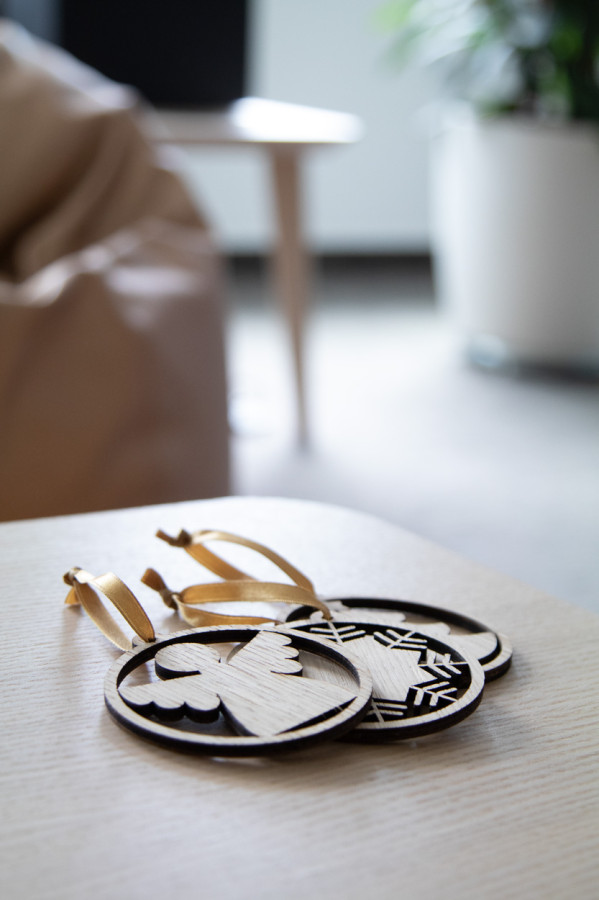 Drevená ozdoba na vianočný stromček so zlatou stuhou. Dodáva sa s oddelenou stuhou.