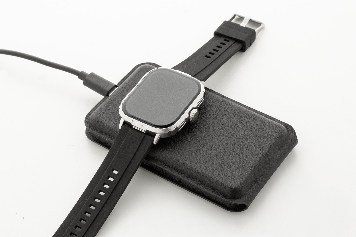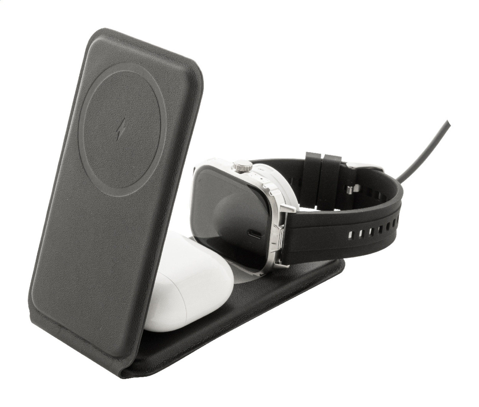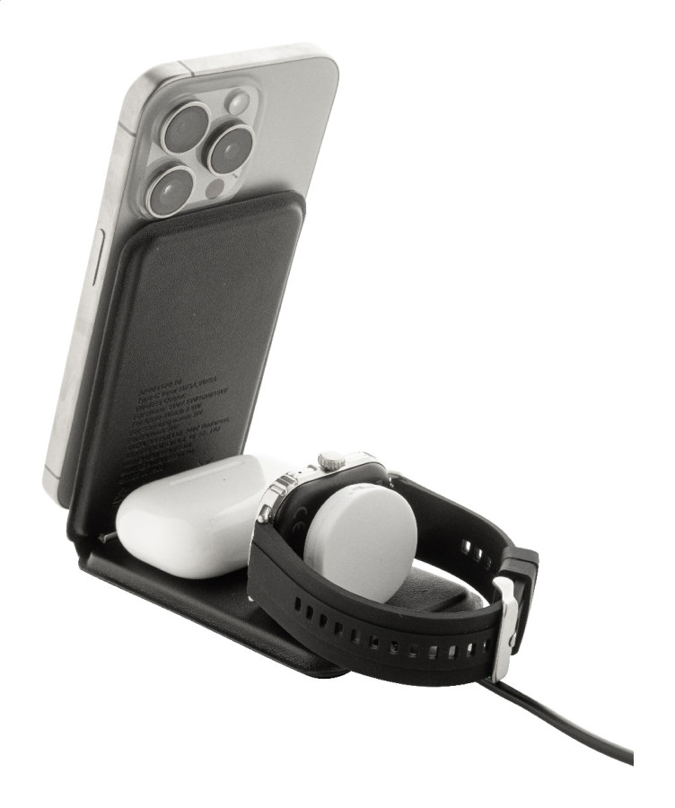Luxusný skladací držiak na mobilný telefón a bezdrôtová nabíjacia sada z recyklovanej PU kože. S magnetickou bezdrôtovou rýchlonabíjačkou (15 W), bezdrôtovou nabíjačkou (5 W) pre slúchadlá (iba Apple®) a bezdrôtovou nabíjačkou (2,5 W) pre inteligentné hodinky (Apple® a Samsung®). Vrátane samolepiaceho kovového krúžku na použitie magnetickej funkcie na akomkoľvek bezdrôtovo nabíjacom zariadení. Kompatibilný s iPhone® 12 alebo novším. Vrátane USB nabíjacieho kábla.