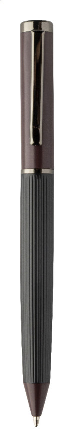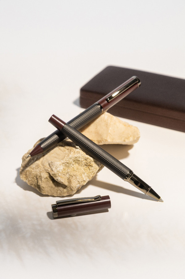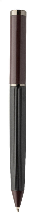 Elegantná sada kovového guľôčkového pera a rollera s pruhovaným telom, farebnými akcentmi a lesklými detailmi vo farbe antracit. Vo farebne zladenej darčekovej krabičke a s modrou náplňou. Produkt značky André Philippe.