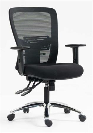 Kancelárska stolička s pohodlným sedadlom dizajnové prevedenie s hrubým, tvarovaným polstrovaním sedadla pre vyšší komfort pri sedení výškové nastavenie pomocou plynového piestu vyvýšené, priedušné sieťované operadlo s nastaviteľnou bedrovou opierkou výšku operadla je možné nastaviť pomocou račňového mechanizmu: jednoducho, jedným pohybom asynchrónna mechanika nastaviteľný uhol operadla nastaviteľný uhol sedadla nastaviteľná hĺbka sedadla nastaviteľná výška opierok nosnosť: 160 kg Poťah: sedadlo: protioderová látka operadlo: napnutá sieťovaná tkanina