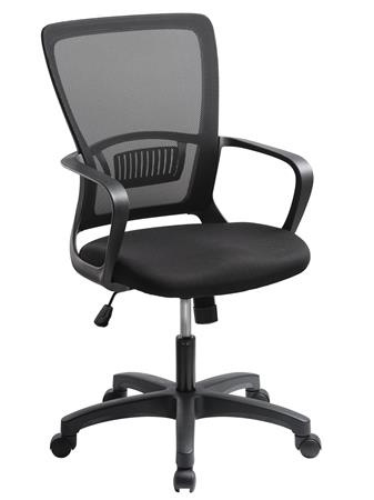 Kancelárska stolička s pohodlným sedadlom dizajnové prevedenie výškové nastavenie pomocou plynového piestu pevná, priedušná sieťovaná opierka chrbta nastaviteľná bedrová opierka aretovateľná hojdacia mechanika pevné opierky nosnosť: 110 kg Poťah: sedadlo: odolná, protioderová látka operadlo: napnutá sieťovaná tkanina