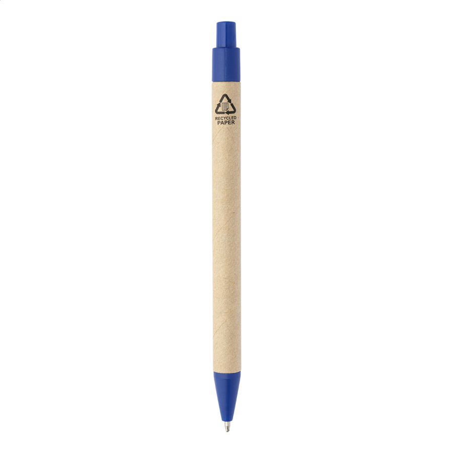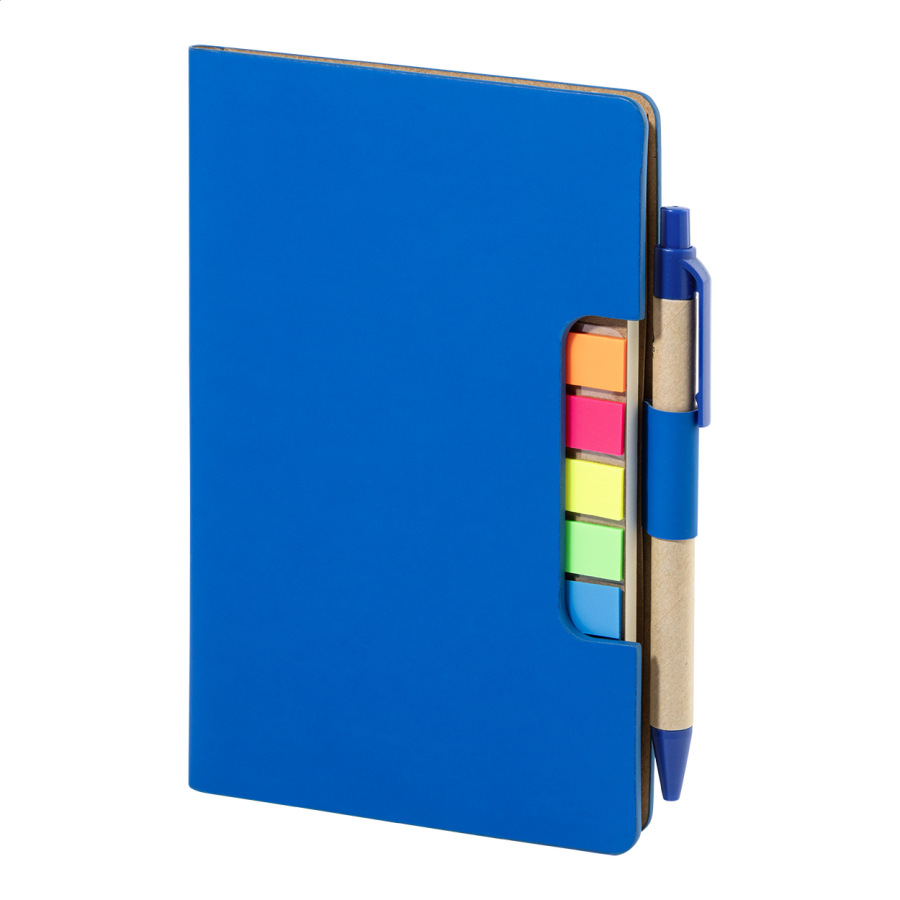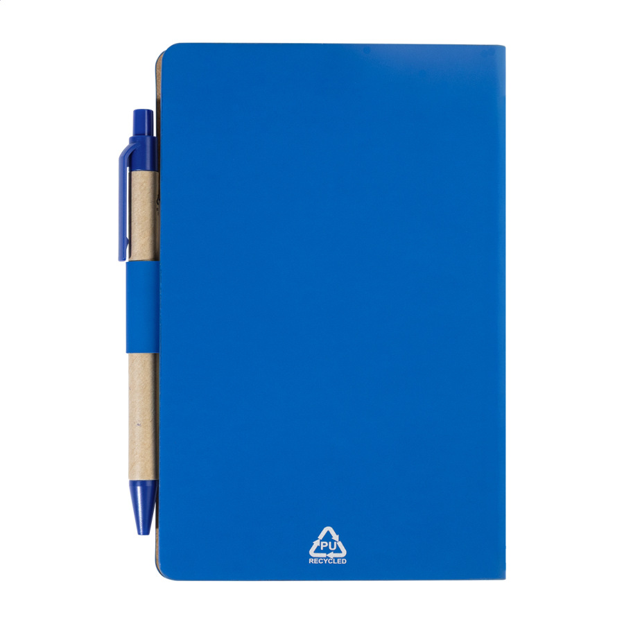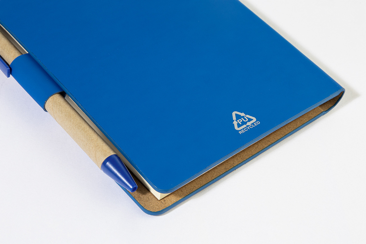 Blok s recyklovanou PU kožou, 70 linajkovými listami z recyklovaného papiera a 125 značkovačmi stránok (v 5 rôznych farbách). Vrátane recyklovaného papiera a guľôčkového pera z recyklovaného PP s modrou náplňou.
