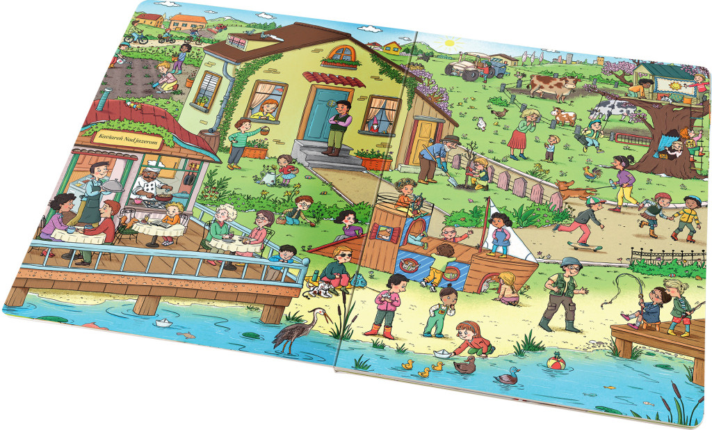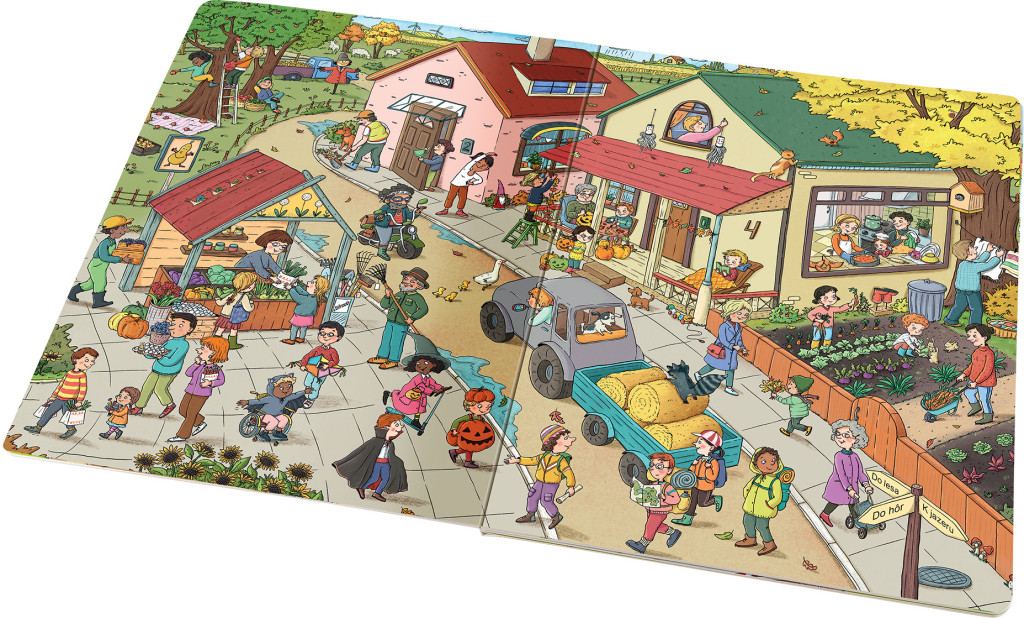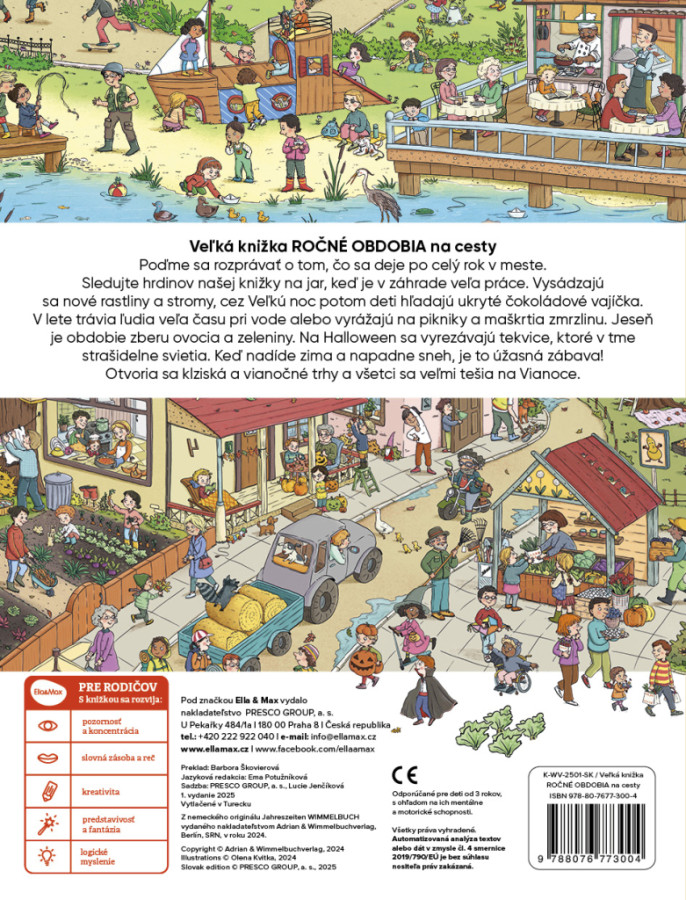 Sledujte hrdinov našej knižky na jar, keď je veľa práce v záhradke, v lete, keď ľudia radi trávia čas pri vode alebo usporadúvajú pikniky a maškrtia zmrzlinu. Alebo na jeseň, v období zberu úrody či na Halloween, keď sa vyrezávajú strašidelné tekvice. A napokon v zime, keď napadne sneh a všetci sa už tešia na Vianoce – úplne rovnako ako deti, ktorým je určená táto krásna knižka plná prepracovaných ilustrácií! Vďaka nej budú vaši najmenší rozvíjať základy svojich predčitateľských schopností. Stačí sa len ponoriť do farebného sveta obrázkov a pozorne sa dívať…