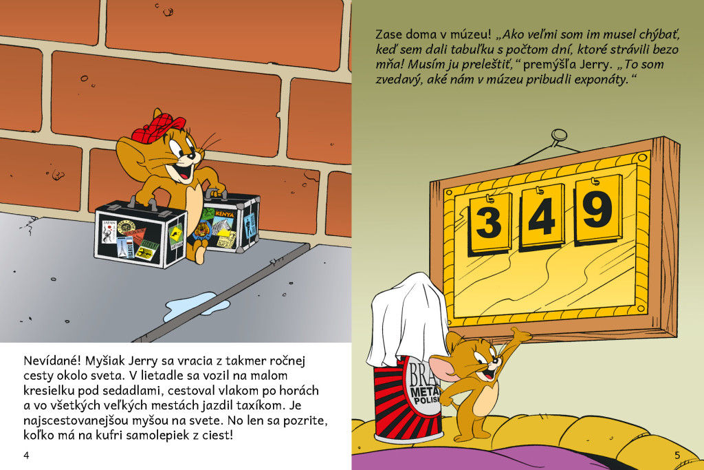 Myšiak Jerry sa vracia po dlhej ceste okolo sveta späť domov, do slávneho múzea. Čo na to hovorí kocúr Tom, ktorý žije v presvedčení, že sa do múzea už nikdy žiadna myš nevráti? Sledujte dobrodružstvá Toma a Jerryho v krátkom vtipnom príbehu stránku za stránkou. Jednoduchý text a množstvo úžasných obrázkov – ako stvorené pre začínajúcich čitateľov!