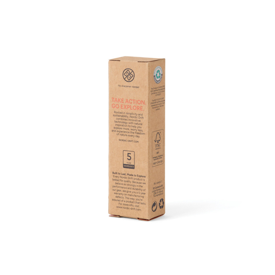 Pero Nordic Drift Trail Infinity Pocket Pen je navrhnuté na použitie v prírode a každod. dobrodružstvá. Grafitová špička sa vysúva pomocou oranžového tlač. na písanie a po použití sa zasunie späť do tela pera, aby bola chránená. Pútko z popruhu na vrchnej časti umožňuje pripevniť pero na batoh, takže ho máte vždy poruke.Na rozdiel od tradičných drevených ceruziek, ktoré dokážu písať približne do 200 metrov, grafitová špička tejto infinity ceruzky umožňuje napísať až pribl. 20 000 metrov. Píše ako bežná ceruzka a grafitové stopy je možné vymazať, pričom špička sa opotrebúva len veľmi pomaly.Pero je vyrobené z recykl. ABS plastu s certif. RCS. Malý kompas na vrchn. časti poskytuje jednoduchú orient. smeru. Produkt je balený v obale s cert. FSC® bez použitia plastu.Všetky produkty Nordic Drift sú testované z hľadiska kvality. Keďže pevne veríme vo výkon a odolnosť nášho vybavenia, na každý výrobok poskyt. 5-r. záruku na výrob. chyby.