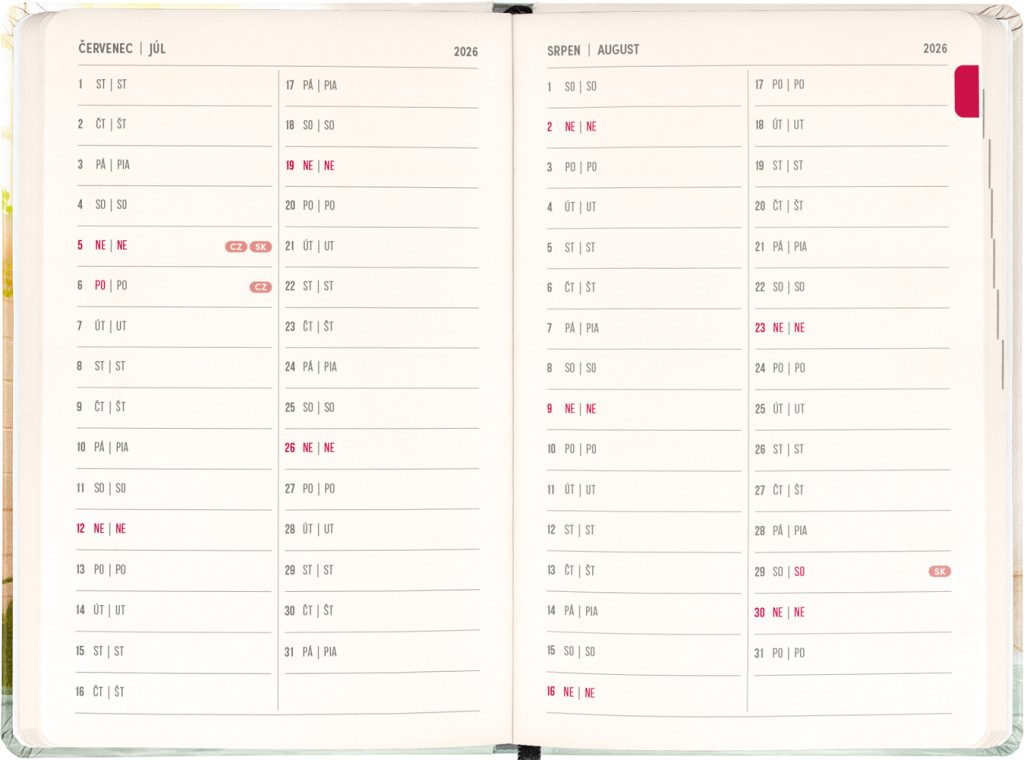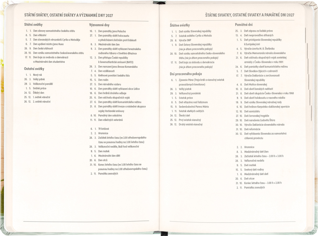 Osemnásťmesačný diár obsahuje prehľad na roky 2026 a 2027, zoznam českých a slovenských mien a česko-slovenský týždenný stĺpcový kalendár s menami a sviatkami. Kalendár začína v júli 2026 a končí v decembri 2027.