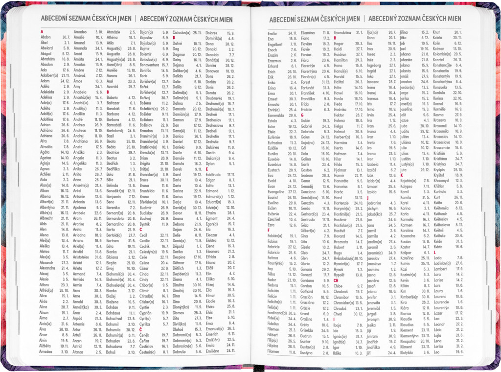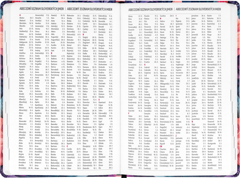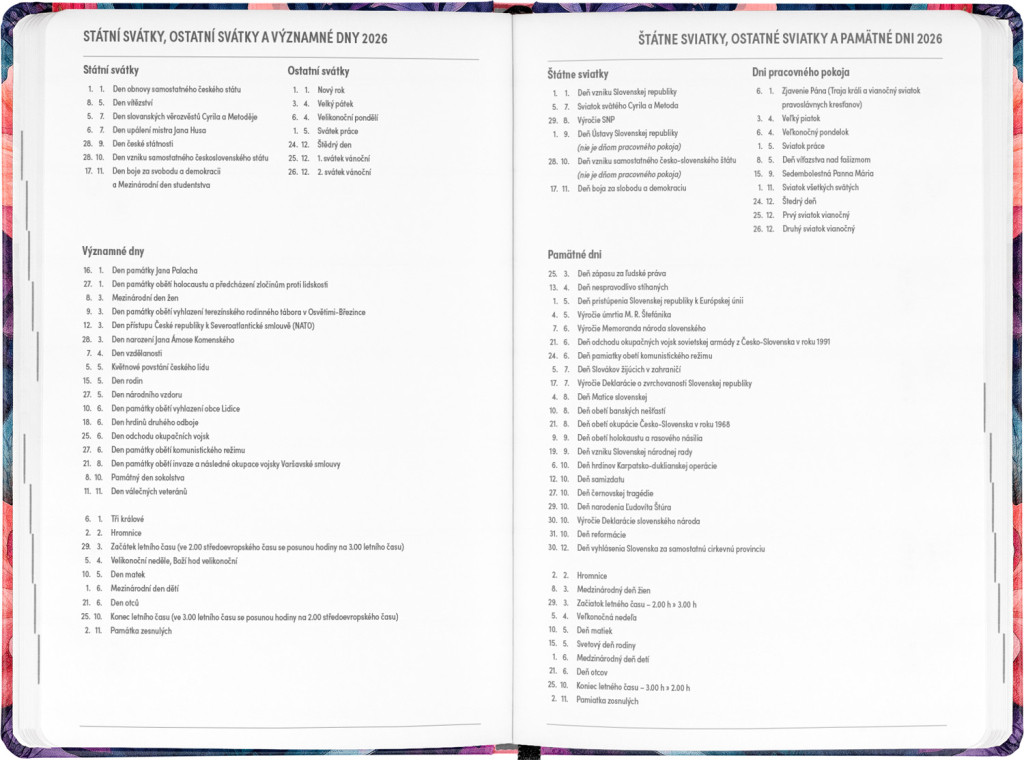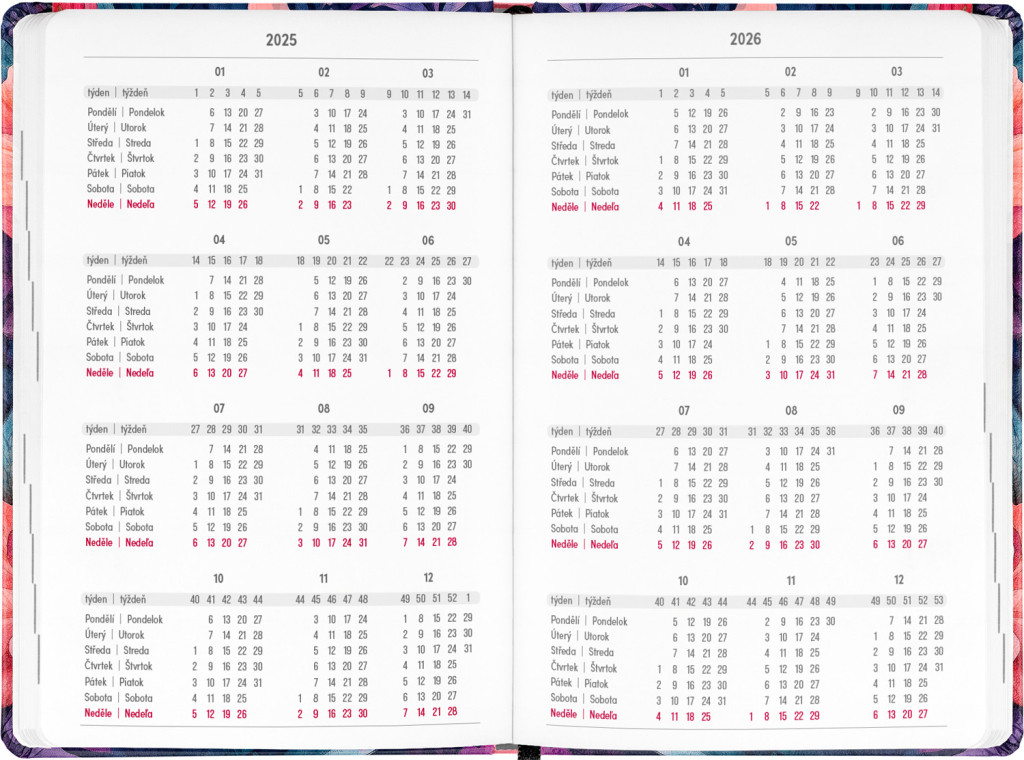 Osemnásťmesačný diár obsahuje prehľad na rok 2025 a 2026, zoznam českých a slovenských mien, česko-slovenské týždenné riadkové kalendárium s menami a sviatkami a priestor na poznámky. Kalendárium začína v júli 2025 a končí v decembri 2026.