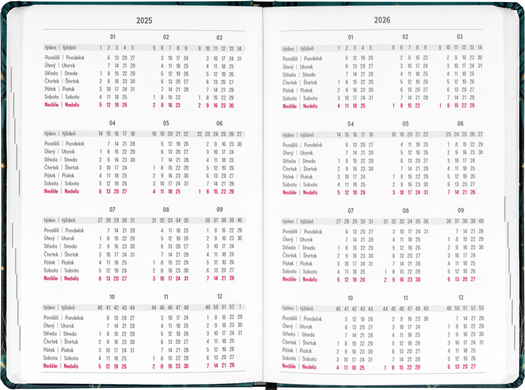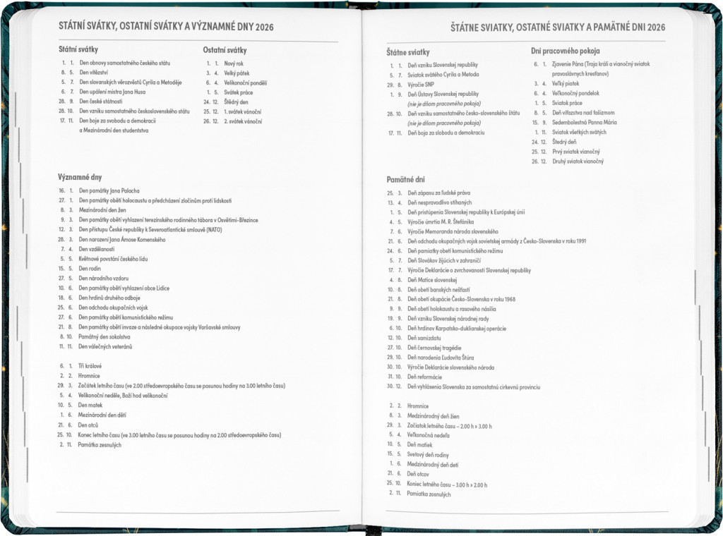 Osemnásťmesačný diár obsahuje prehľad na rok 2025 a 2026, zoznam českých a slovenských mien, česko-slovenské týždenné riadkové kalendárium s menami a sviatkami a priestor na poznámky. Kalendárium začína v júli 2025 a končí v decembri 2026.