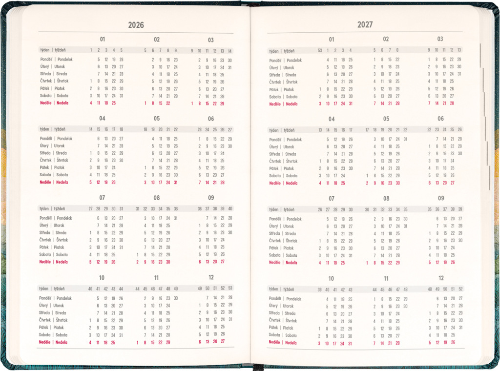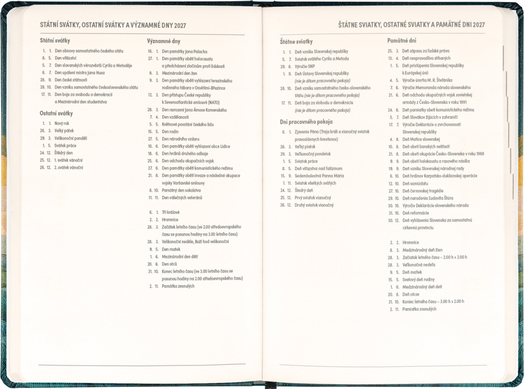 Osemnásťmesačný diár obsahuje prehľad na roky 2026 a 2027, zoznam českých a slovenských mien a česko-slovenský týždenný stĺpcový kalendár s menami a sviatkami. Kalendár začína v júli 2026 a končí v decembri 2027