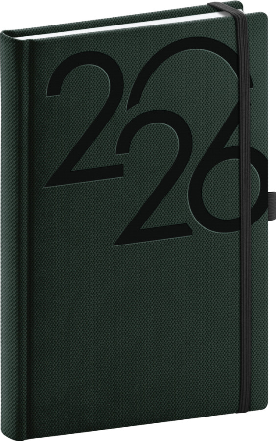 Denný diár Ajax 2026 v zelenej farbe. Jemne štruktúrovaný povrch s atypickým reliéfom je vhodný pre všetky typy razieb. Diár má zaguľatené rohy, pútko na ceruzku a elastickú gumičku. Denný rozvrh s česko-slovenským kalendáriom a doplnkovou angličtinou, nemčinou, maďarčinou a ruštinou.