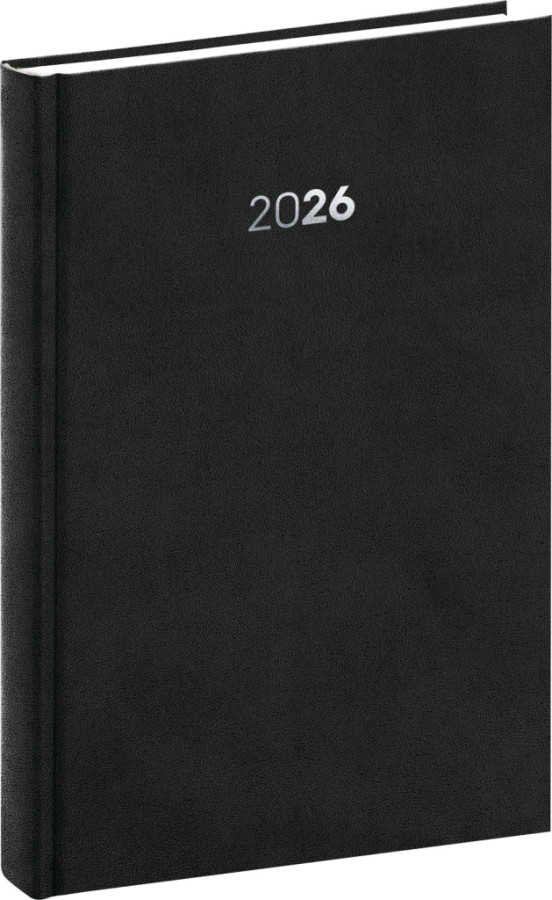 Plánovací denný diár Balakon 2026 v čiernom prevedení, doplnený o strieborný letopočet. Povrch diára si získal obľubu vďaka kvalitnému vrchnému materiálu, ktorý je extrémne odolný voči vonkajšiemu poškodeniu. Denný rozvrh s česko-slovenským kalendáriom a doplnkovou angličtinou, nemčinou, maďarčinou a ruštinou.