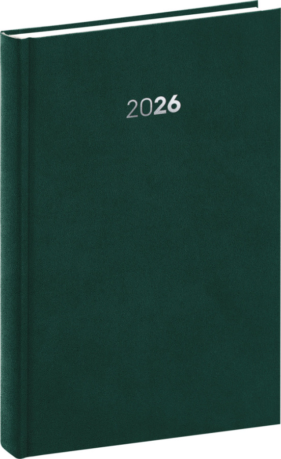 Plánovací denný diár Balakon 2026 v zelenom prevedení, doplnený o strieborný letopočet. Povrch diára si získal obľubu vďaka kvalitnému vrchnému materiálu, ktorý je extrémne odolný voči vonkajšiemu poškodeniu. Denný rozvrh s česko-slovenským kalendáriom a doplnkovou angličtinou, nemčinou, maďarčinou a ruštinou.