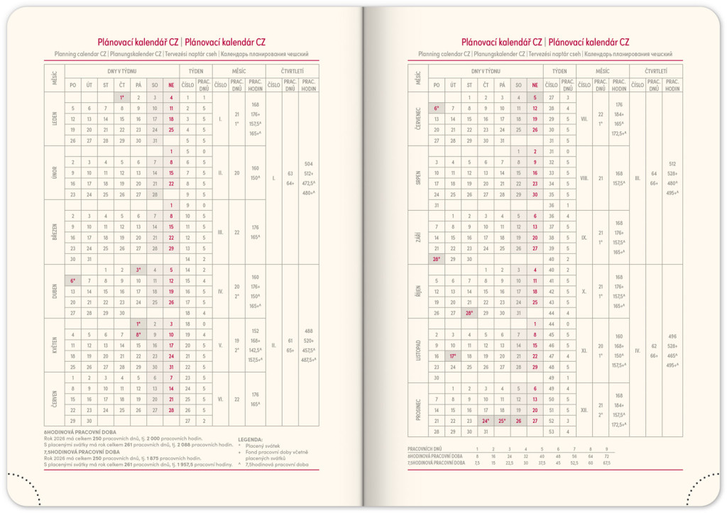Denný diár Diamante 2026 v červenej farbe. Povrch diára má jemnú štruktúru pripomínajúcu výbrus diamantu a je ideálny pre všetky typy razieb. Diár má zaguľatené rohy, pútko na ceruzku a elastickú gumičku. Denný rozvrh s česko-slovenským kalendáriom a doplnkovou angličtinou, nemčinou, maďarčinou a ruštinou.