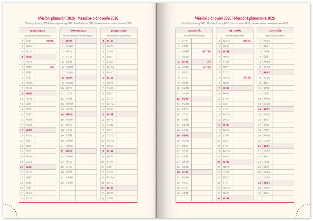 Nový, cenovo dostupný rad diárov s obálkou z ekologického papiera spája štýl a udržateľnosť. Denné rozloženie s česko-slovenským kalendáriom a doplnkovou angličtinou, nemčinou, maďarčinou a ruštinou.