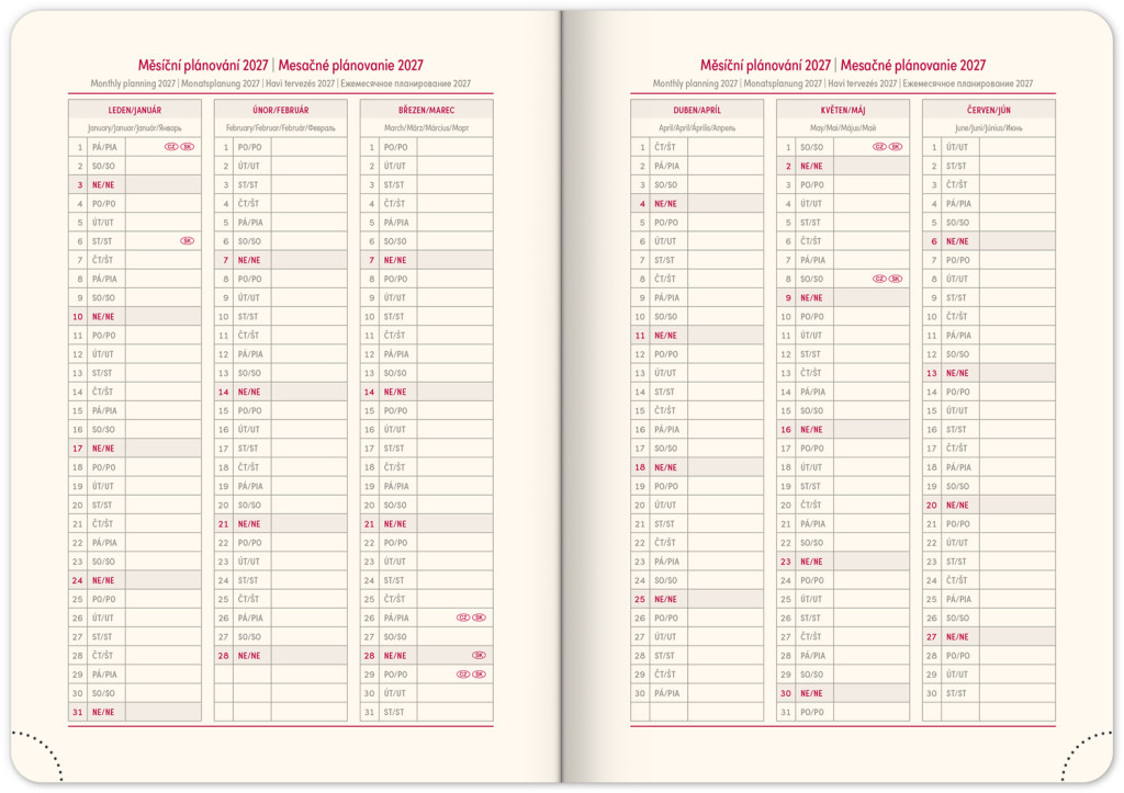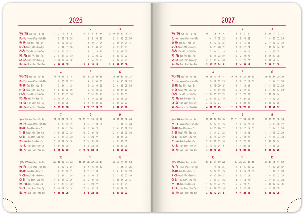Denný diár Twill 2026 v modro-zlatej farbe. Dva povrchy spojené efektným lepením - jednofarebný materiál je doplnený metalickým povrchom s razbou letopočtu. Diár má zaguľatené rohy, pútko na ceruzku a elastickú gumičku. Denný rozvrh s česko-slovenským kalendáriom a doplnkovou angličtinou, nemčinou, maďarčinou a ruštinou.