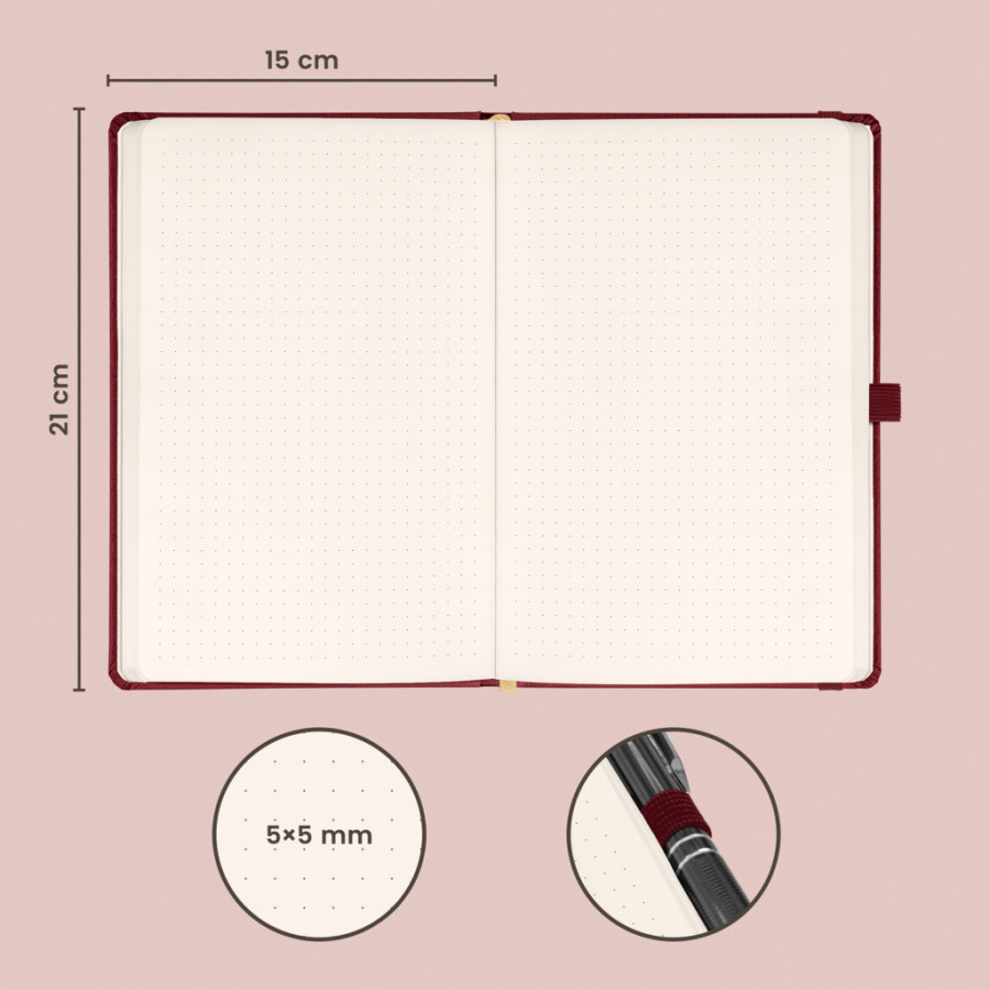 Bodkovaný notes Balacron 2025 v prevedení bordó. Povrch diára si získal obľubu vďaka kvalitnému vrchnému materiálu, ktorý je extrémne odolný voči vonkajšiemu poškodeniu.