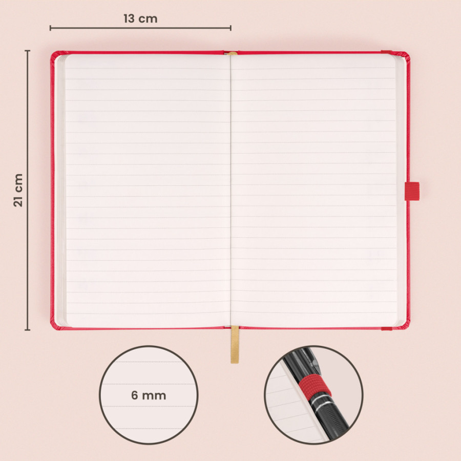 Praktický a ľahký linajkovaný notes v klasickej červenej farbe má povrch s hrubšou štruktúrou, na ktorý si môžete nechať vyraziť logo spoločnosti. Notes má pevnú knižnú väzbu a zaoblené rohy, pútko na pero, elastickú gumičku a textilnú záložku. Linajky majú 6 mm a sú na kvalitnom žltom papieri.