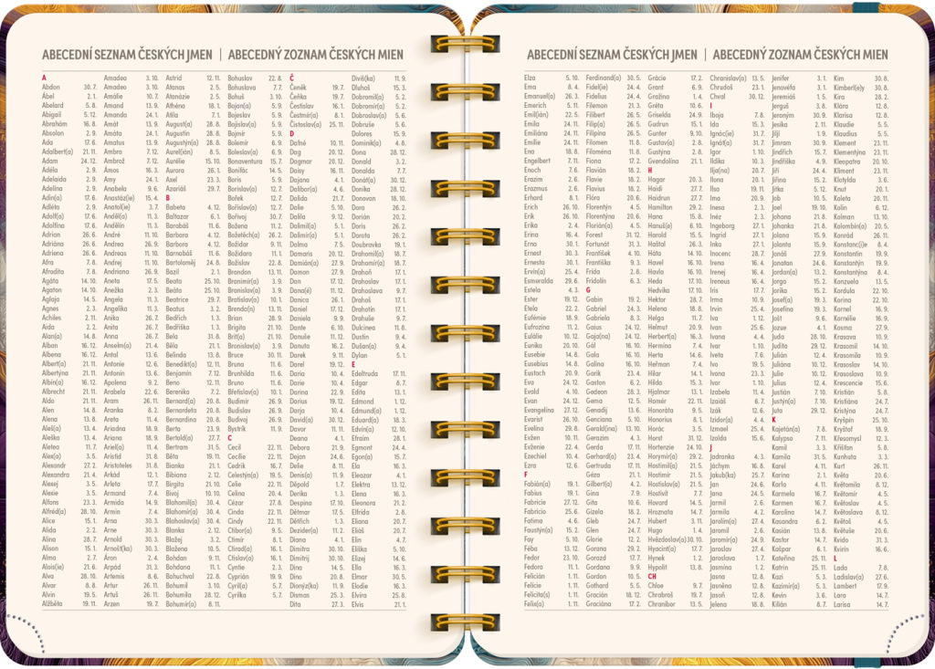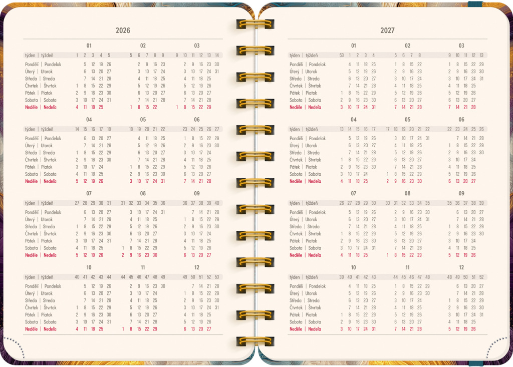 Osemnásťmesačný diár obsahuje prehľad na roky 2026 a 2027, zoznam českých a slovenských mien, česko-slovenský týždenný riadkový kalendár s menami a sviatkami a priestor na poznámky v každom týždni. Kalendár začína v júli 2026 a končí v decembri 2027.