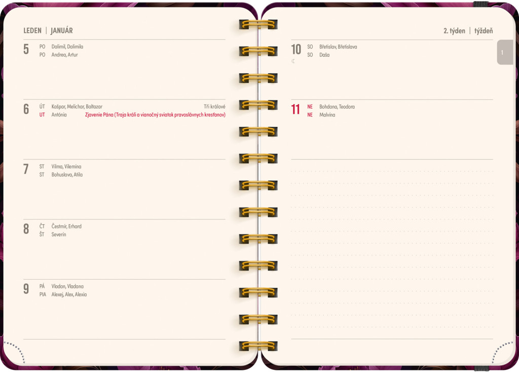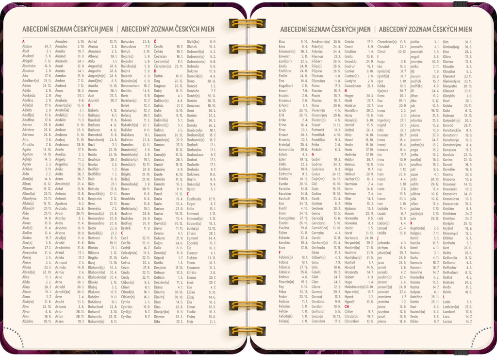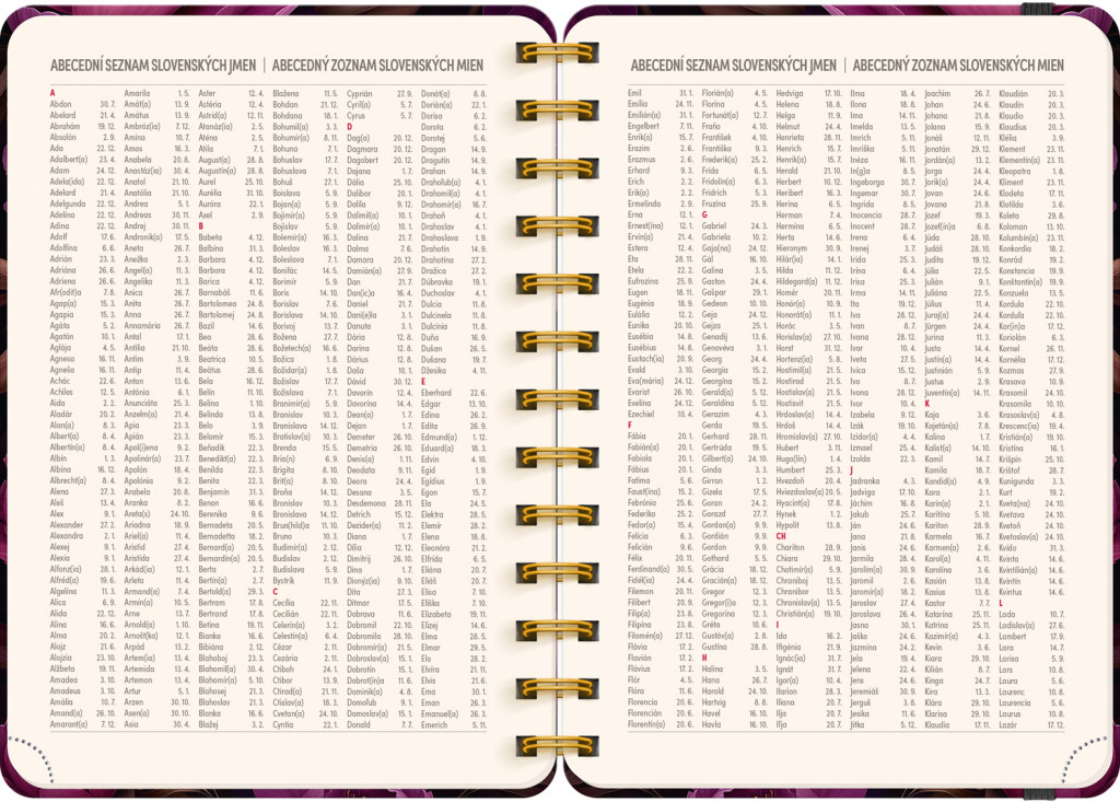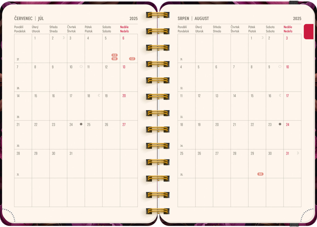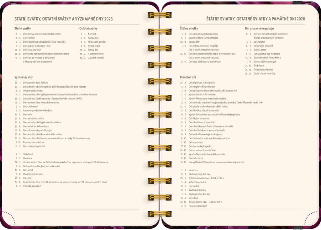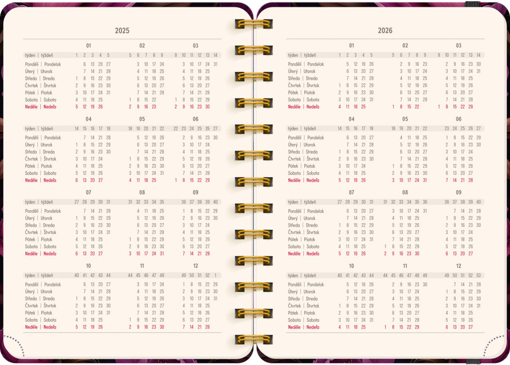 Osemnásťmesačný diár obsahuje prehľad na rok 2025 a 2026, zoznam českých a slovenských mien, česko-slovenské týždenné riadkové kalendárium s menami a sviatkami a priestor na poznámky. Kalendárium začína v júli 2025 a končí v decembri 2026.