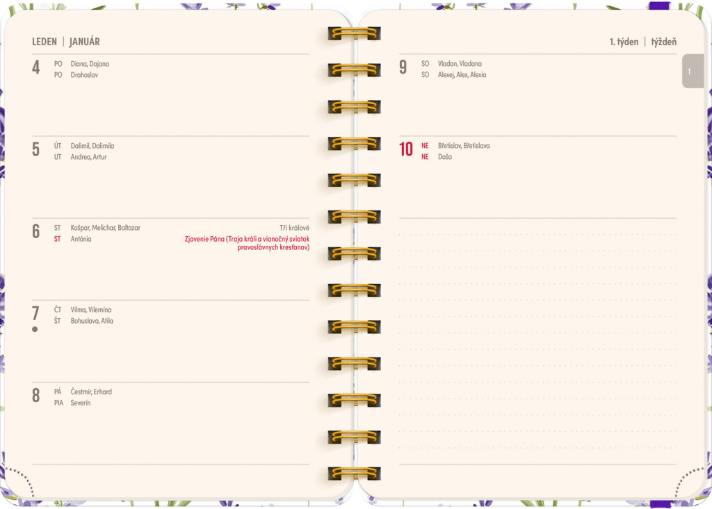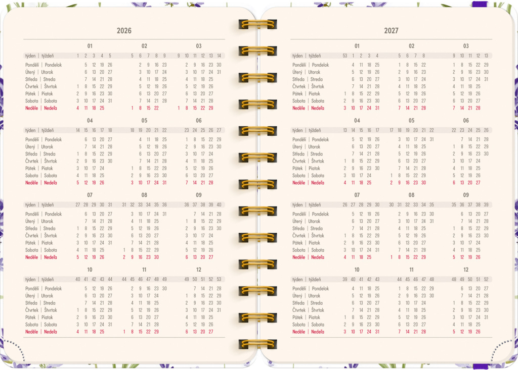 Osemnásťmesačný diár obsahuje prehľad na roky 2026 a 2027, zoznam českých a slovenských mien, česko-slovenský týždenný riadkový kalendár s menami a sviatkami a priestor na poznámky v každom týždni. Kalendár začína v júli 2026 a končí v decembri 2027.
