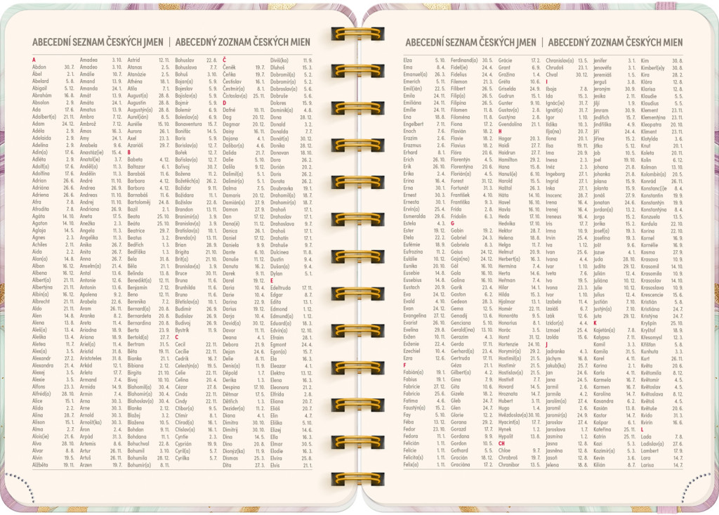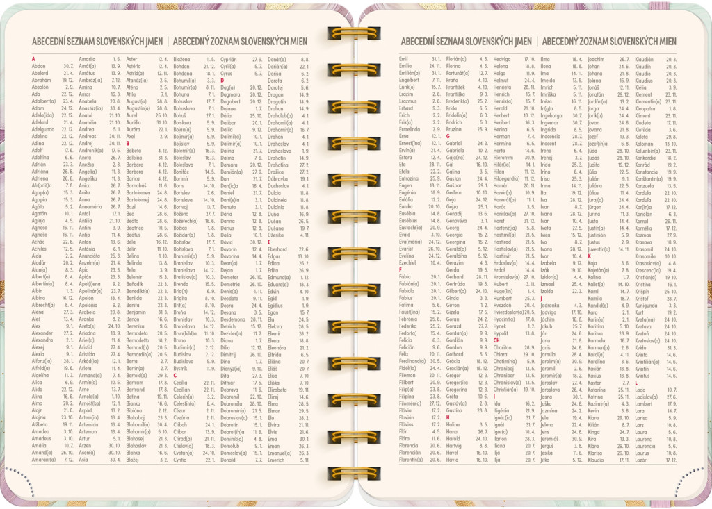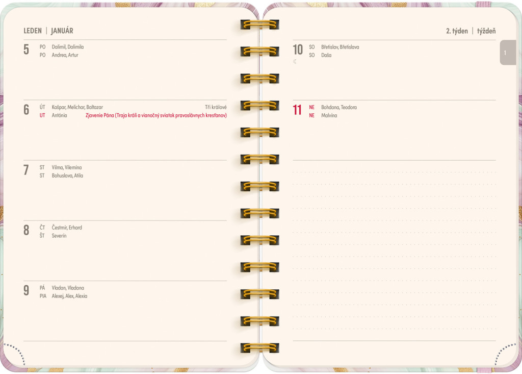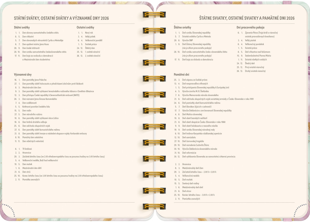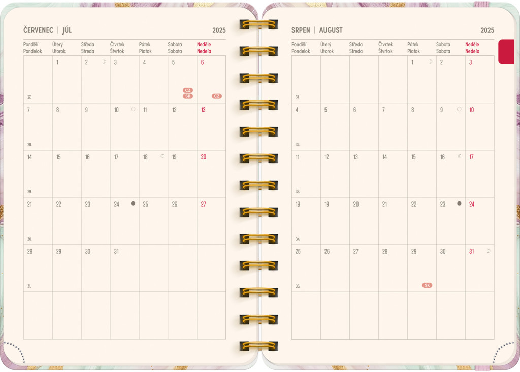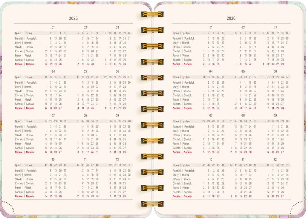 Osemnásťmesačný diár obsahuje prehľad na rok 2025 a 2026, zoznam českých a slovenských mien, česko-slovenské týždenné riadkové kalendárium s menami a sviatkami a priestor na poznámky. Kalendárium začína v júli 2025 a končí v decembri 2026.
