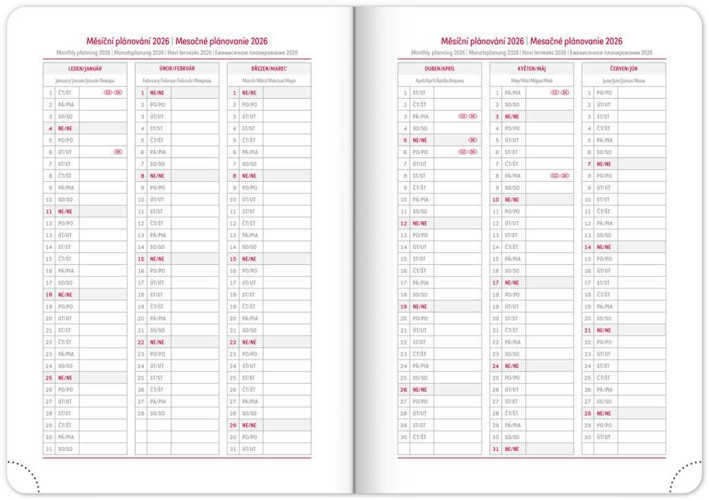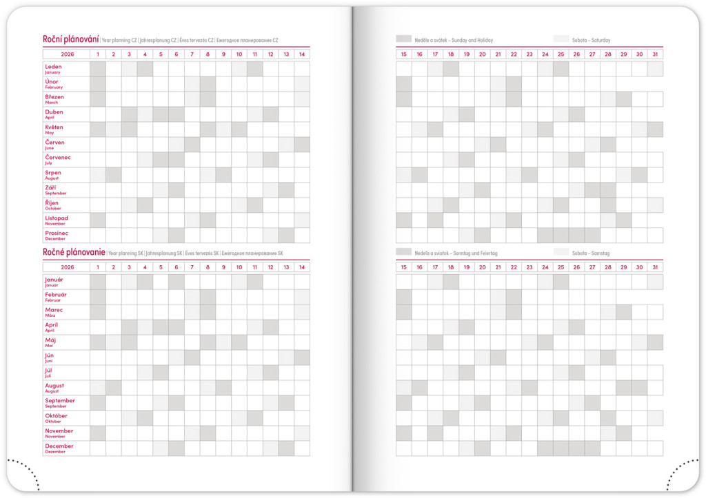 Týždenný diár Ajax 2026 v zelenej farbe. Jemne štruktúrovaný povrch s atypickým reliéfom je vhodný pre všetky typy razieb. Diár má zaguľatené rohy, pútko na ceruzku a elastickú gumičku. Týždenný rozvrh s česko-slovenským kalendáriom a doplnkovou angličtinou, nemčinou, maďarčinou a ruštinou.