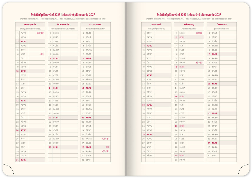 Týždenný diár Diamante 2026 v čiernej farbe. Povrch diára má jemnú štruktúru pripomínajúcu výbrus diamantu a je ideálny pre všetky typy razieb. Diár má zaguľatené rohy, pútko na ceruzku a elastickú gumičku. Týždenný rozvrh s česko-slovenským kalendáriom a doplnkovou angličtinou, nemčinou, maďarčinou a ruštinou.