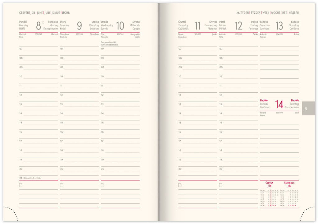 Nový rad diárov s výrazným letopočtom. Povrch má jemnú štruktúru a je vhodný pre všetky typy razieb. Týždenné rozloženie s česko-slovenským kalendáriom a doplnkovou angličtinou, nemčinou, maďarčinou a ruštinou.
