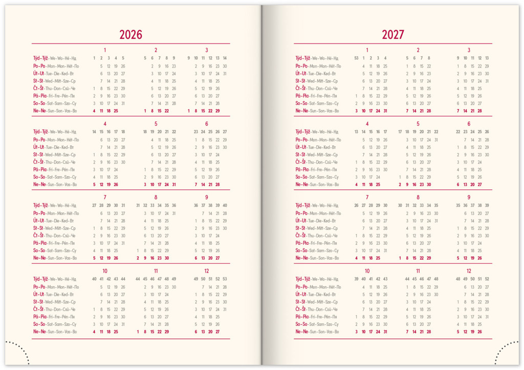 Nový rad diárov v modernom dizajne doplnenom o pevnú gumičku a pútko na pero. Týždenné rozloženie s česko-slovenským kalendáriom a doplnkovou angličtinou, nemčinou, maďarčinou a ruštinou.