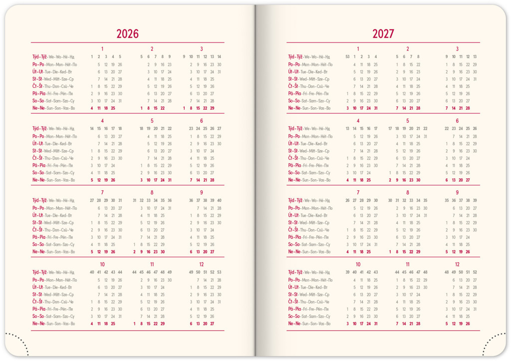 Týždenný diár Twill 2026 v bordó-zlatej farbe. Dva povrchy spojené efektným lepením - jednofarebný materiál je doplnený metalickým povrchom s razbou letopočtu. Diár má zaguľatené rohy, pútko na ceruzku a elastickú gumičku. Týždenný rozvrh s česko-slovenským kalendáriom a doplnkovou angličtinou, nemčinou, maďarčinou a ruštinou.