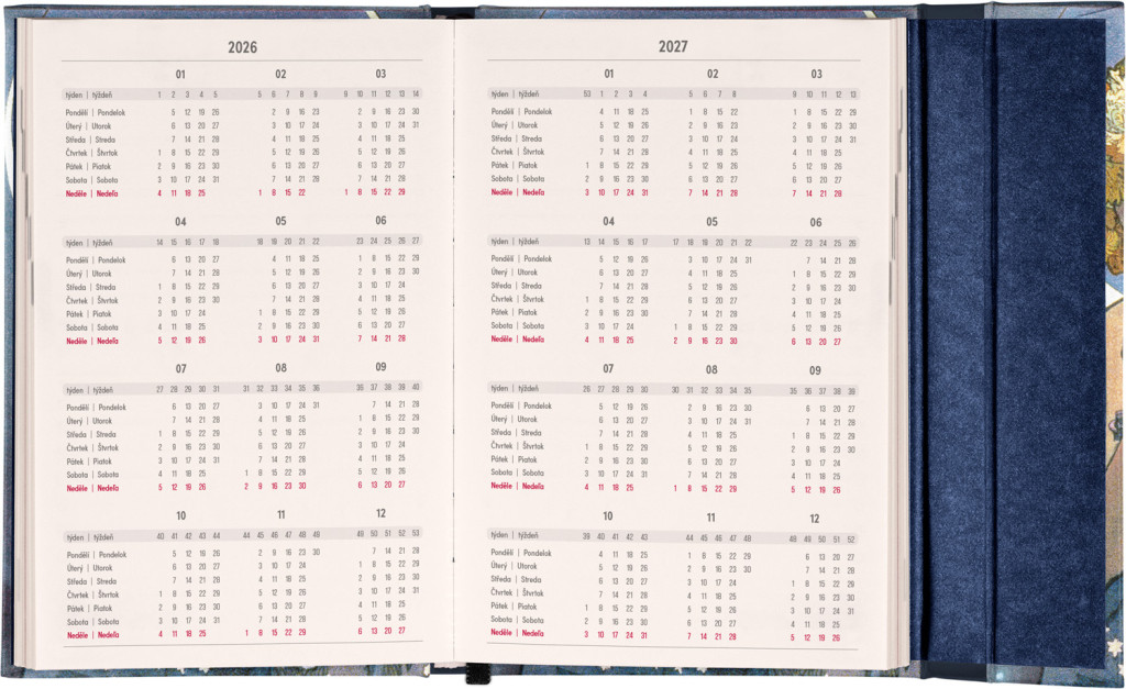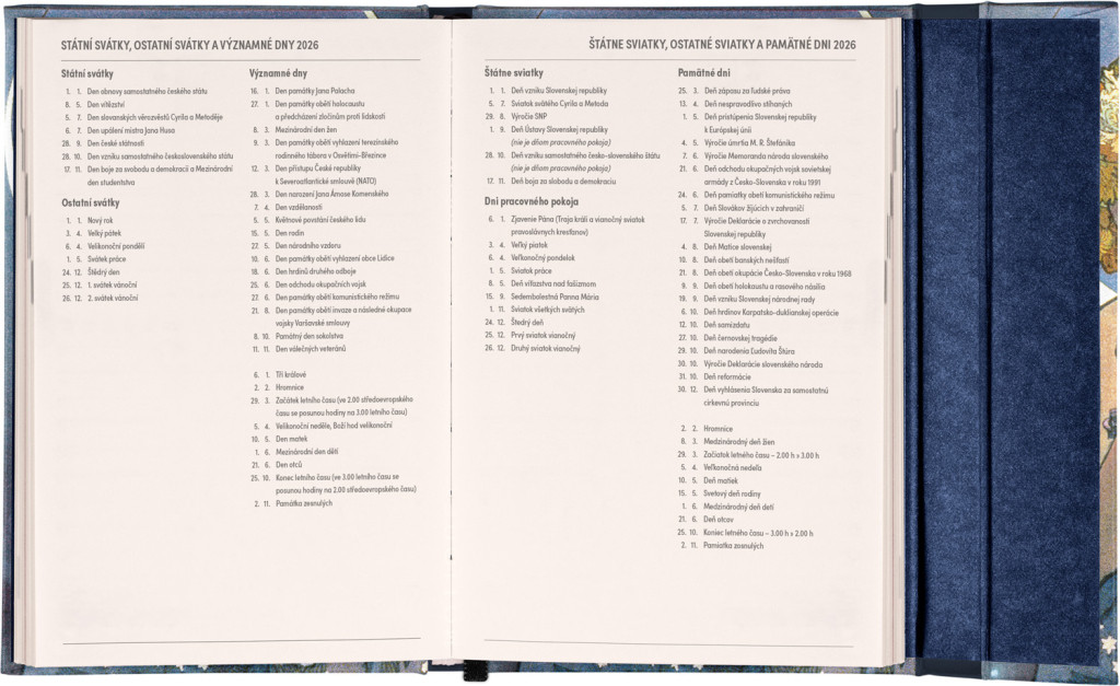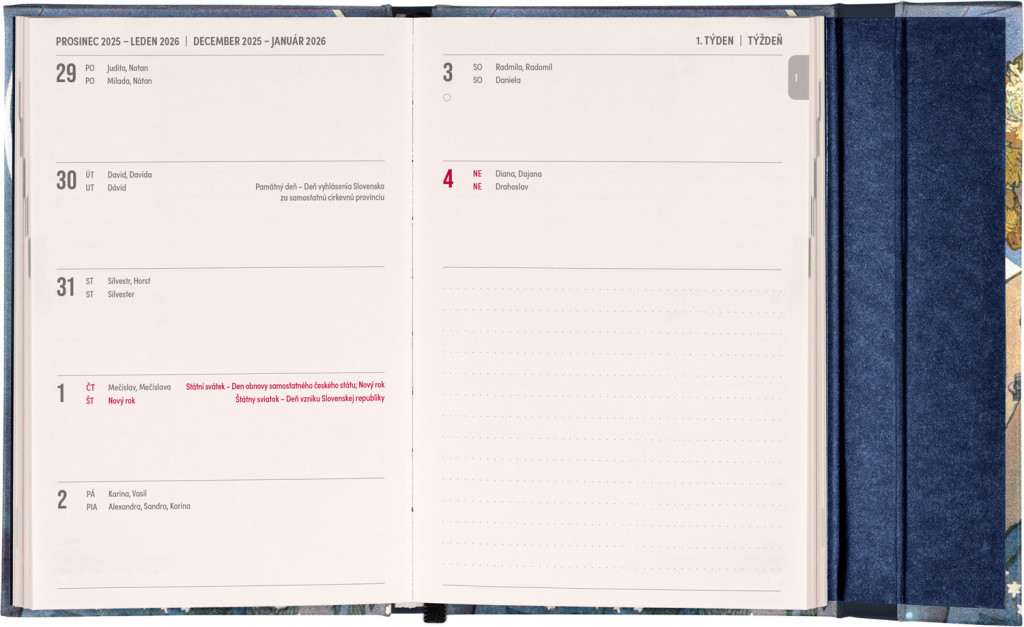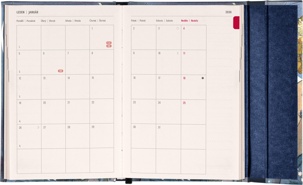 Týždenný diár s praktickým magnetickým uzatváraním je ideálnou voľbou pre tých, ktorí chcú mať svoje plány prehľadne pod kontrolou. Horizontálne rozloženie s českým a slovenským kalendáriom vo verzii týždeň na dvoch stranách s priestorom pre poznámky.Súčasťou sú praktické mesačné prehľady, ideálne na plánovanie dovoleniek či prázdnin a taktiež zoznam českých a slovenských sviatkov a menín.